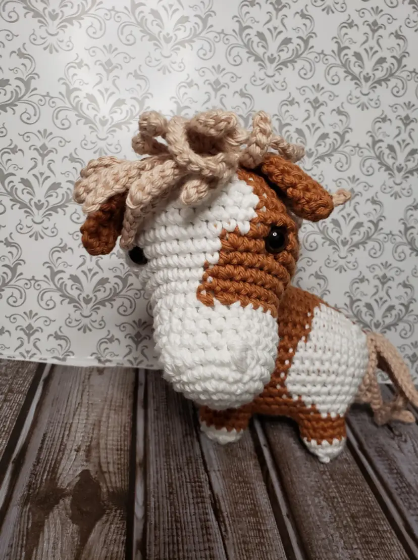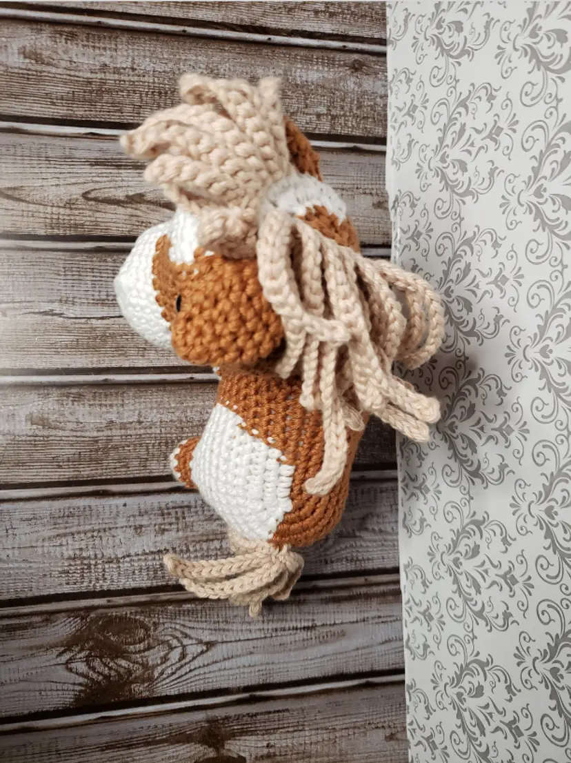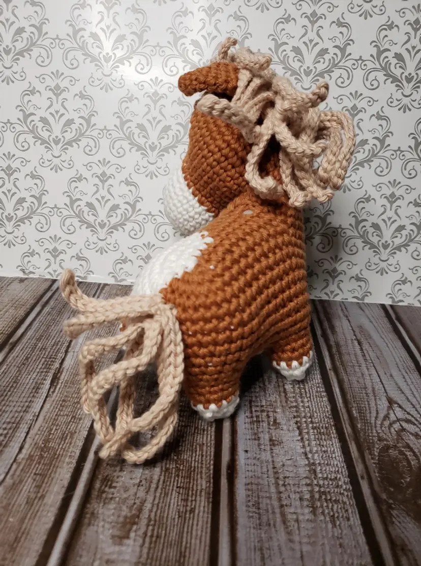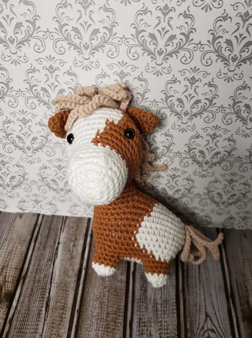 This adorable pony is looking for a new stall to call home. It is made from soft yarn, safety eyes and super soft stuffing.