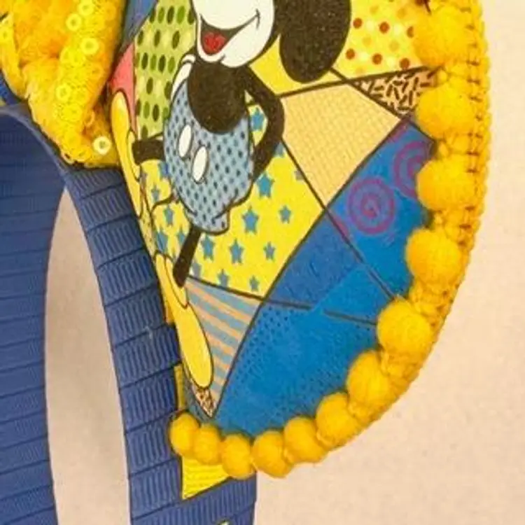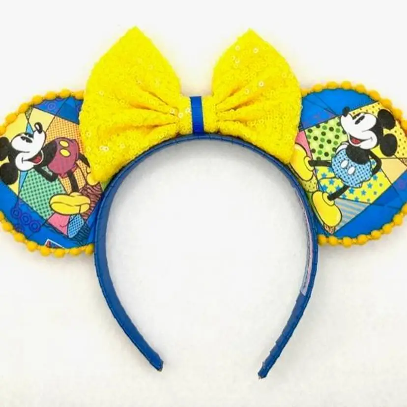 Color blocked ears in vivid primary colors are inspired by favorite Disney artist, Romero Britto. Ear edges are golden yellow pom poms and the straight woven blue and golden yellow headband enhance the overall look. A yellow sequin bow completes the look.