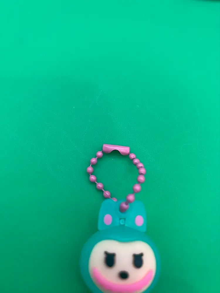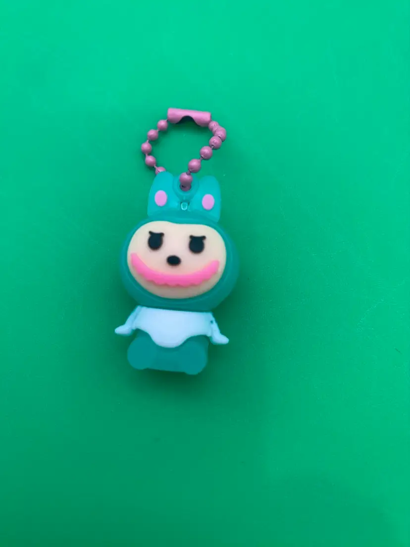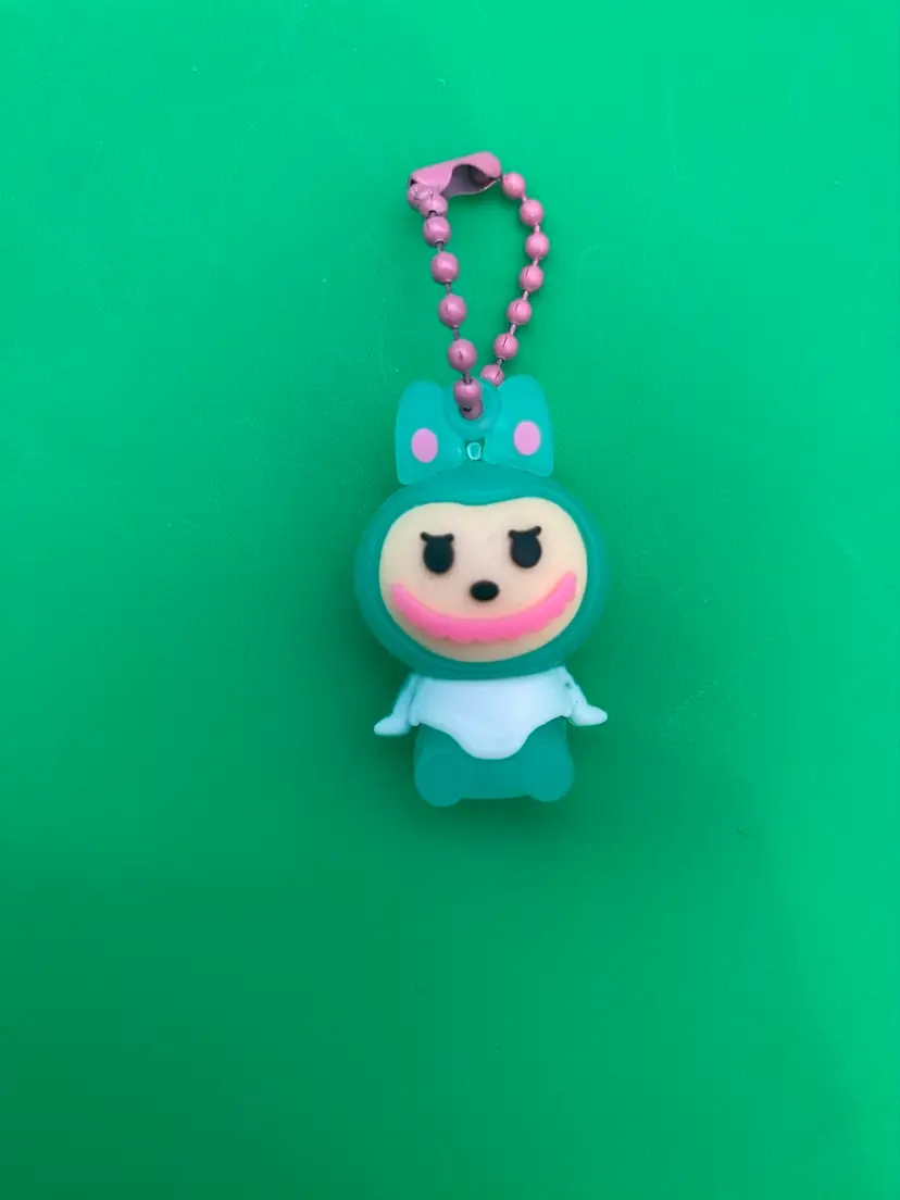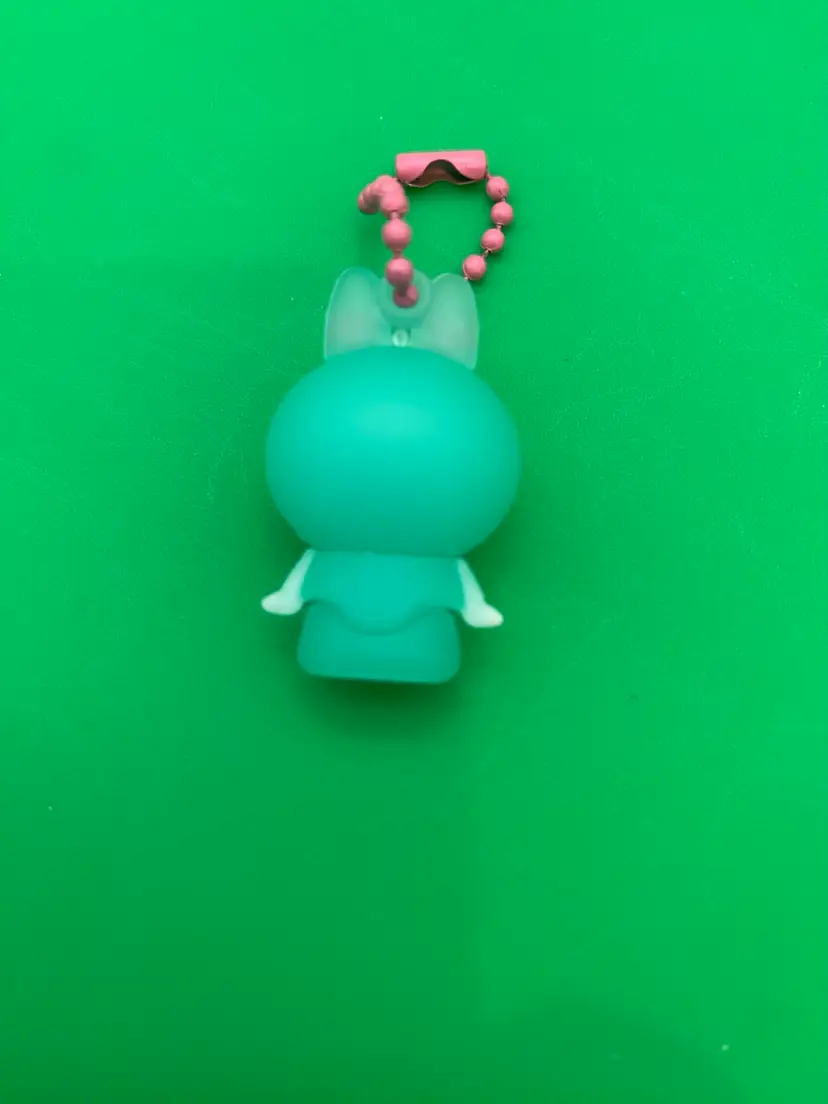 You are purchasing one Miniature Teal Rubber Labubu Keychain or Bag Charm w/ a Pink Chain by Pop Mart. This Keychain hangs a total of 2 inches, and the Labubu is around 1.25 of that. This Keychain is in great condition with no chips, cracks or splits in the material.