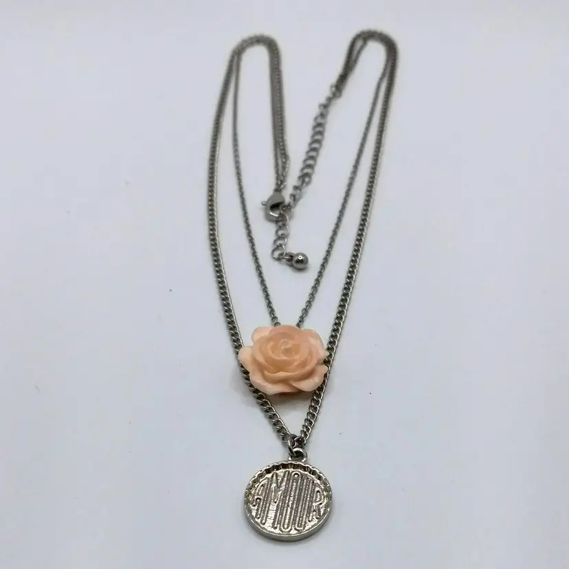 This Popesco Style Peach Rose Amour Pendants Two Strand Layered Silver Tone Necklace is an exquisite accessory for women. Its peach rose pendant and dual strands exude a unique charm and elegance.