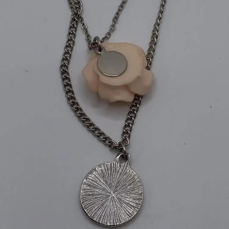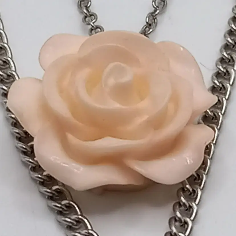 • Popesco style necklace • Peach rose and amour pendants • Dual strand design • Silver tone finish • Perfect accessory for women