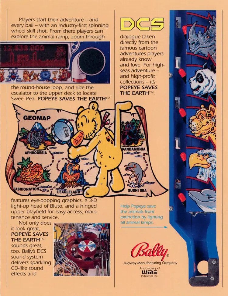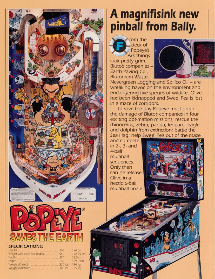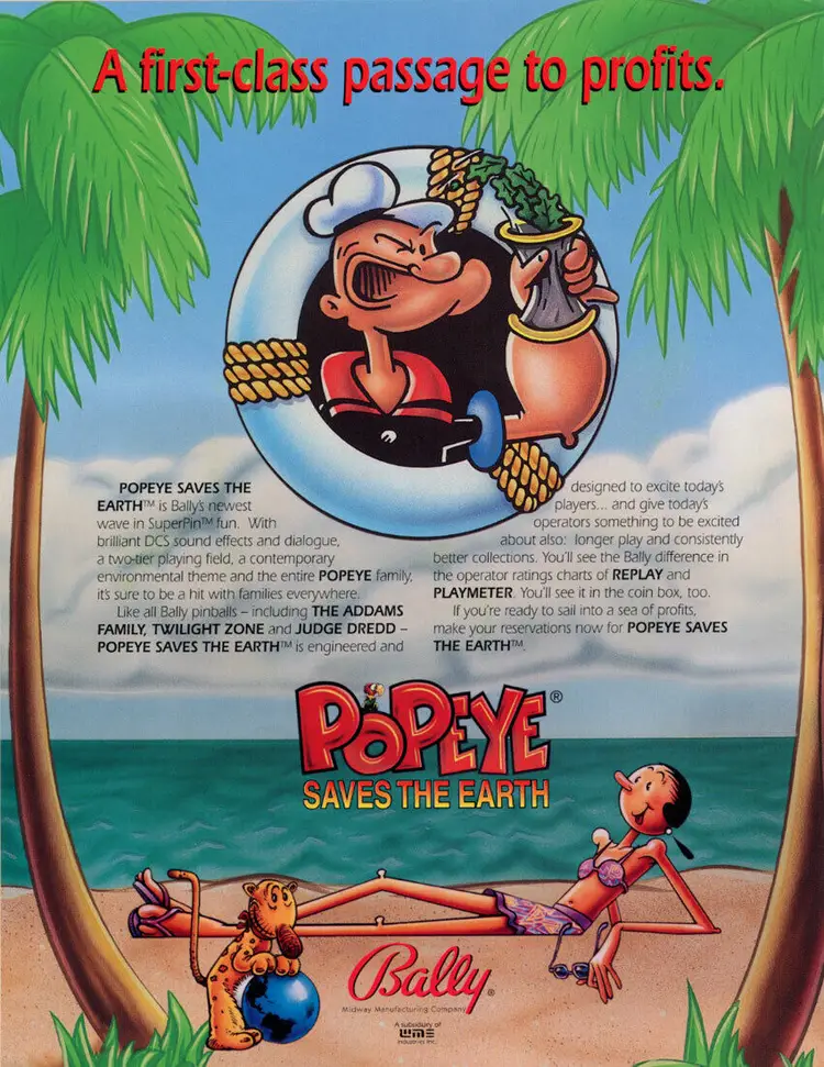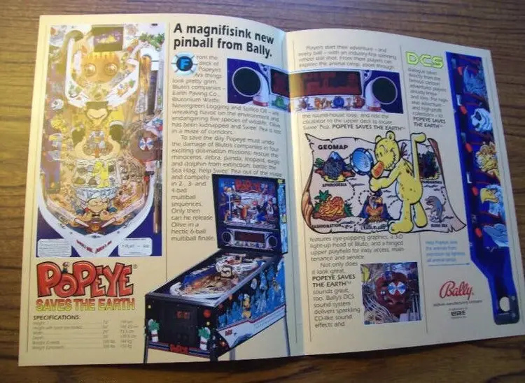 Brand: Bally Year: 1994 Model: Popeye Saves The Earth Country/Region of Manufacture: United States Original: Paper Promotional Advertising Subject: Popeye Modified Item: No Pinball: Flyer