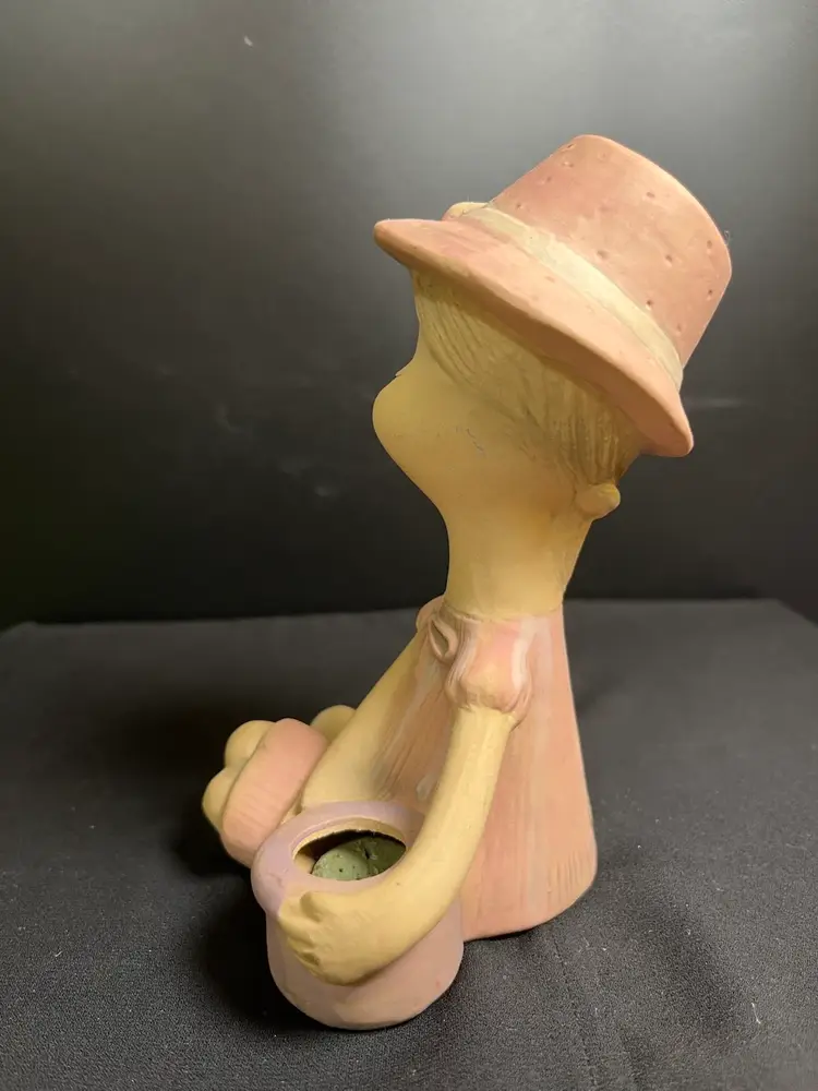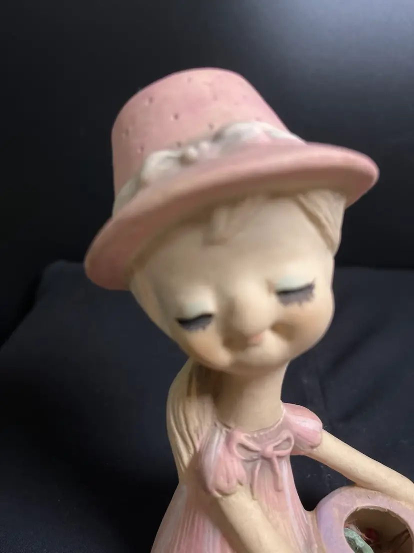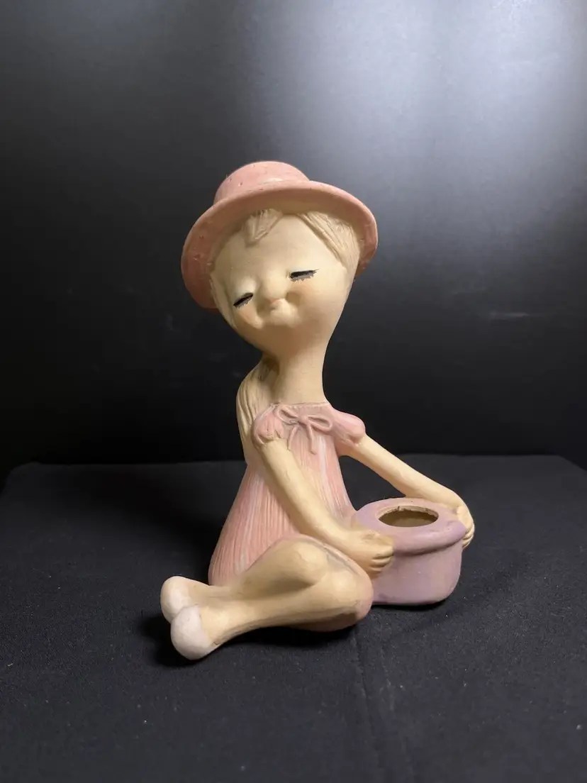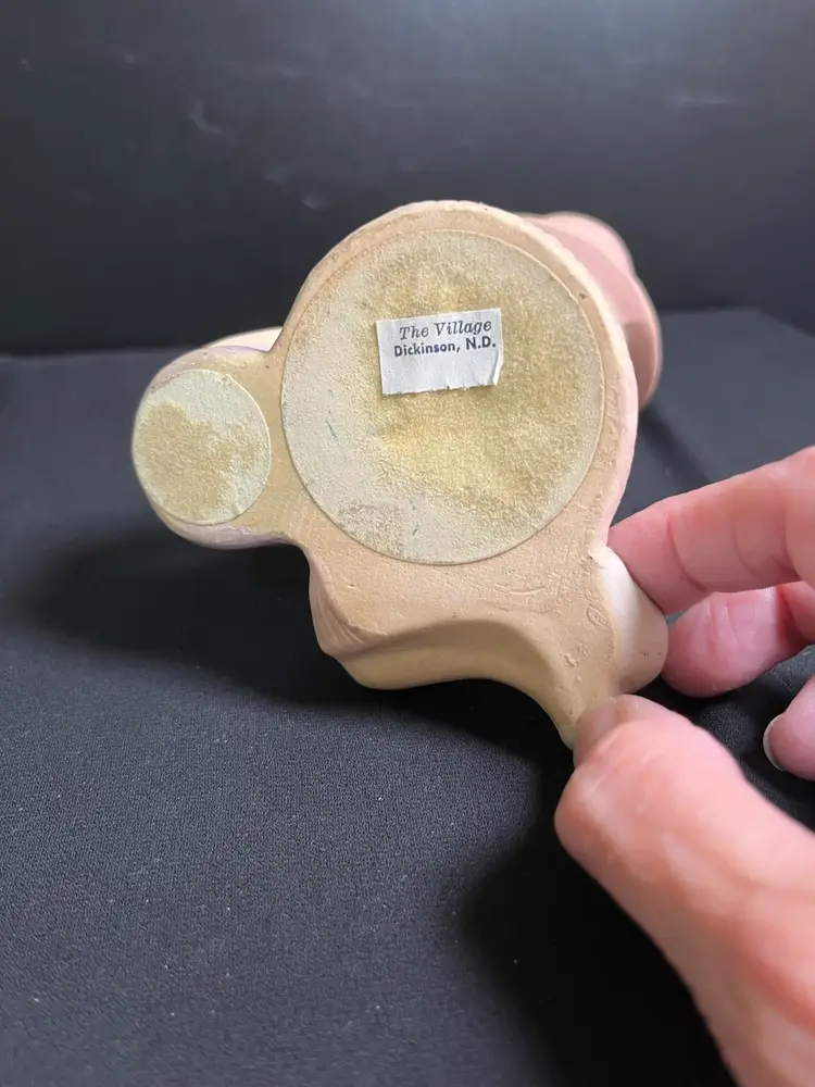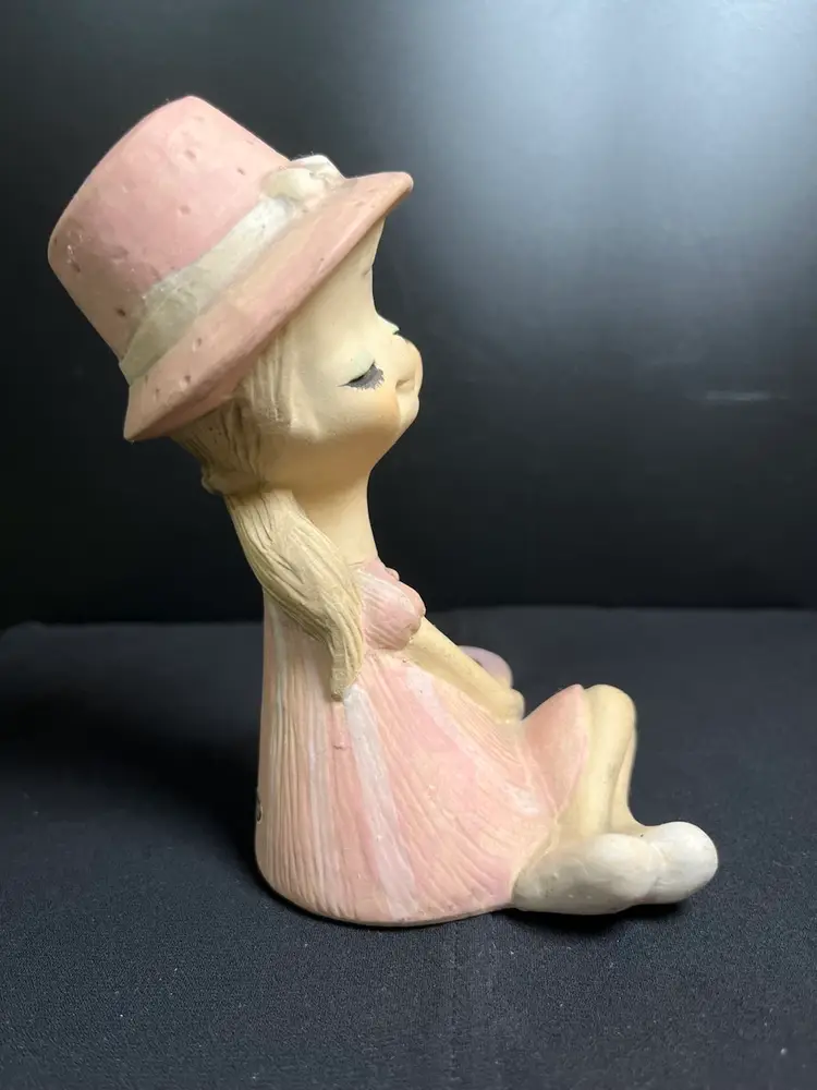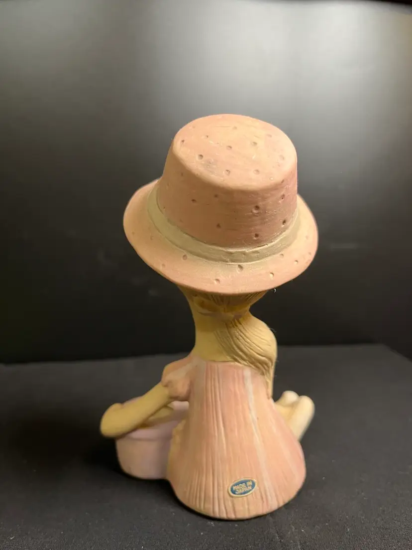 Has a Made in Japan sticker. Uniquely textured details. Pink is in guys......This is in great vintage condition. There are no chips or cracks. I didn't want to immerse her in water as I was afraid of damaging her. I wiped her w/ a wet rag the best I could. She still has ND dust on her. She measures approx 5.5"H, 4"W, 6.3 Oz