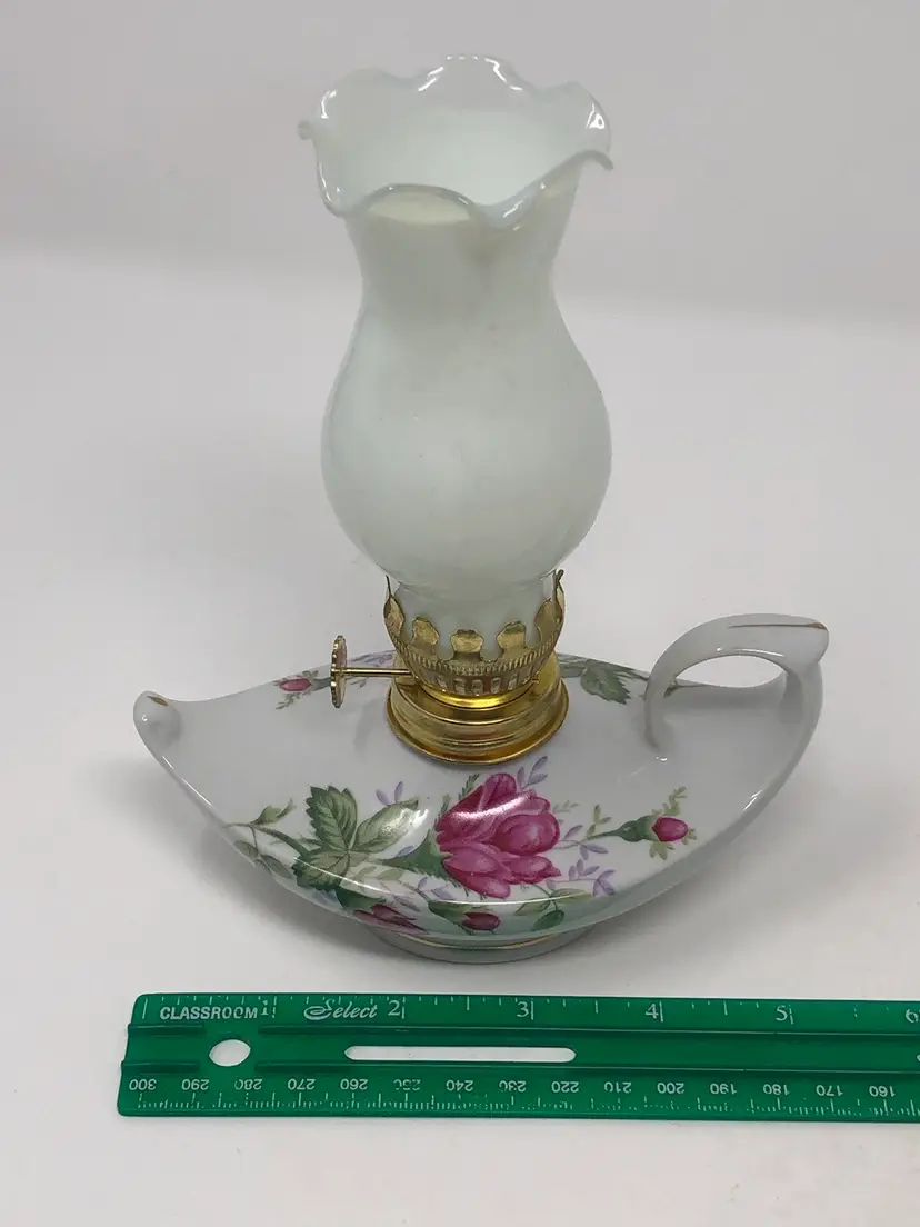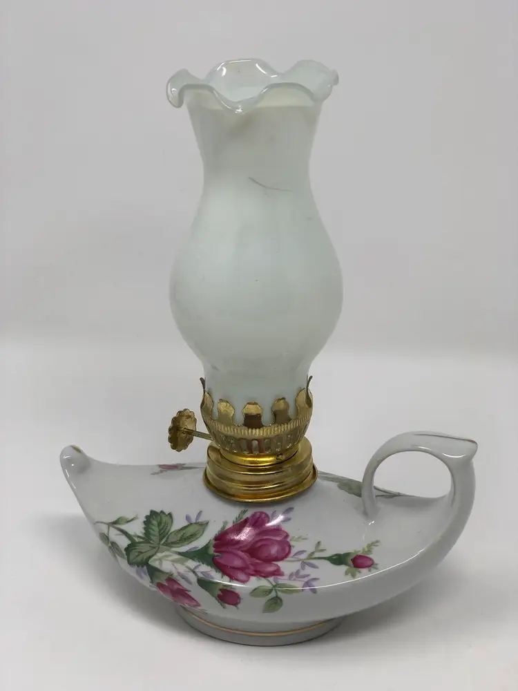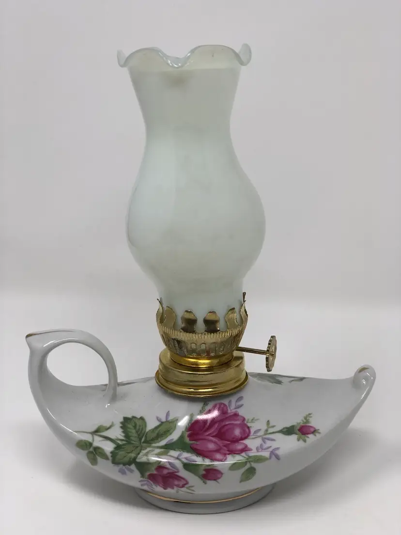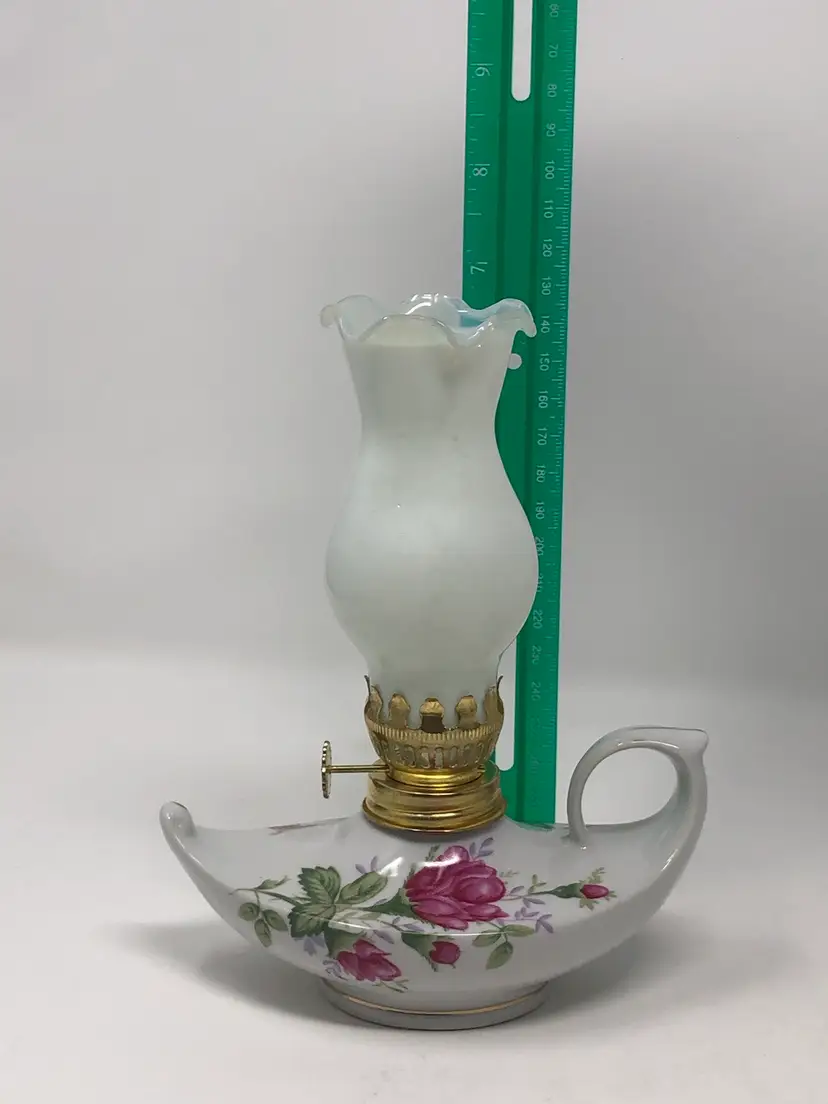 Beautiful Aladdin style oil lamp with porcelain base for oil, metal wick mechanism and glass shade. 5 1/2" from end to end and 7" with the shade. No markings or labels, no chips or cracks