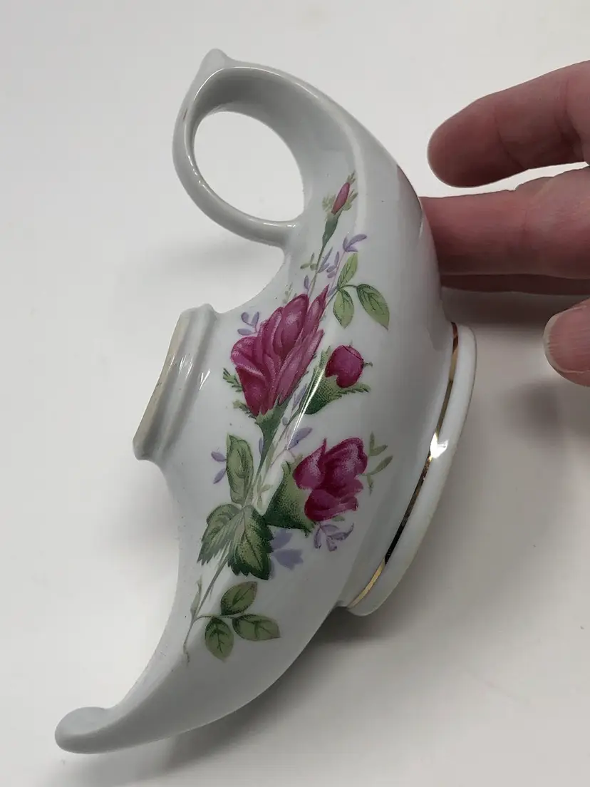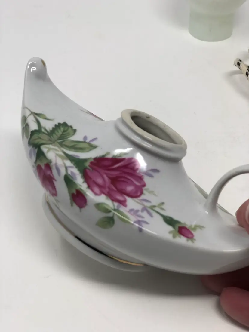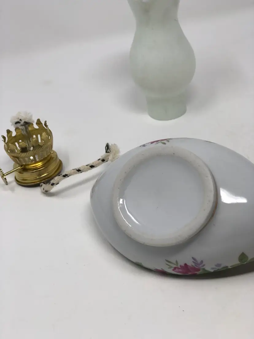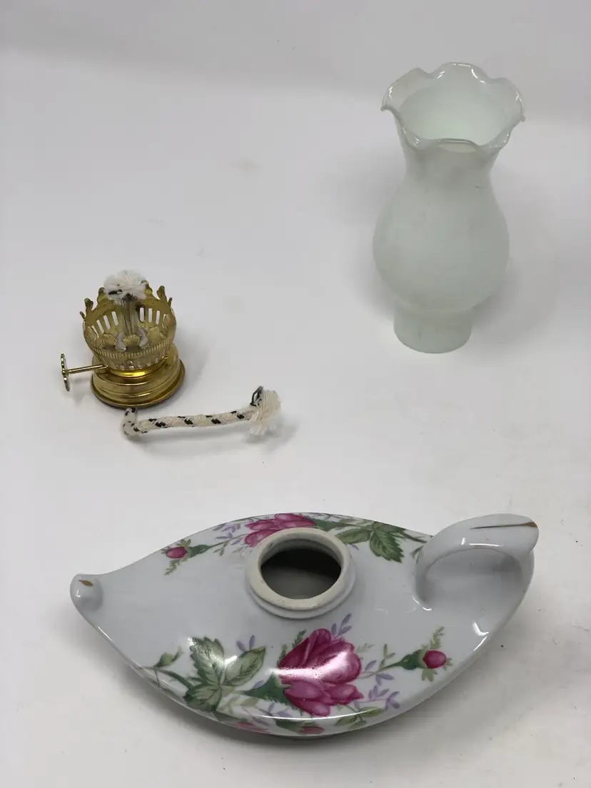 Beautiful Aladdin style oil lamp with porcelain base for oil, metal wick mechanism and glass shade. 5 1/2" from end to end and 7" with the shade. No markings or labels, no chips or cracks