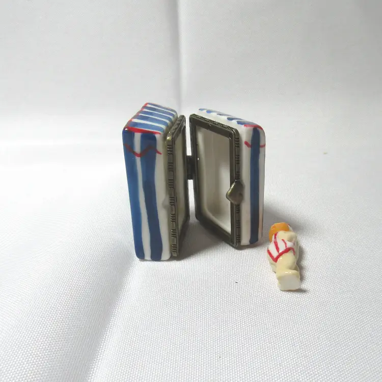 Porcelain Bath House Hinged Trinket Box w/ Bathing Beauty Swimmer Trinket New old stock in box 2" tall