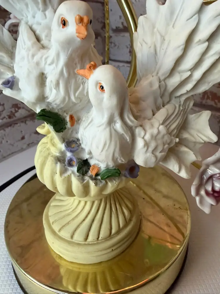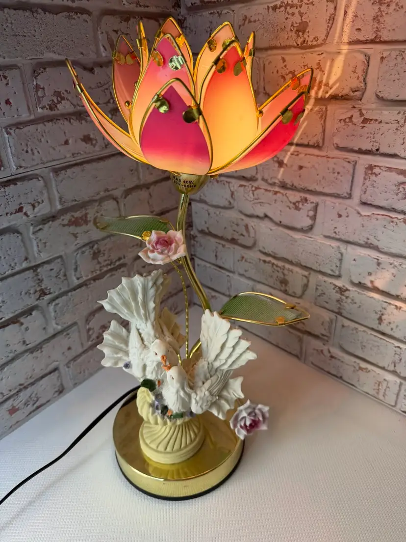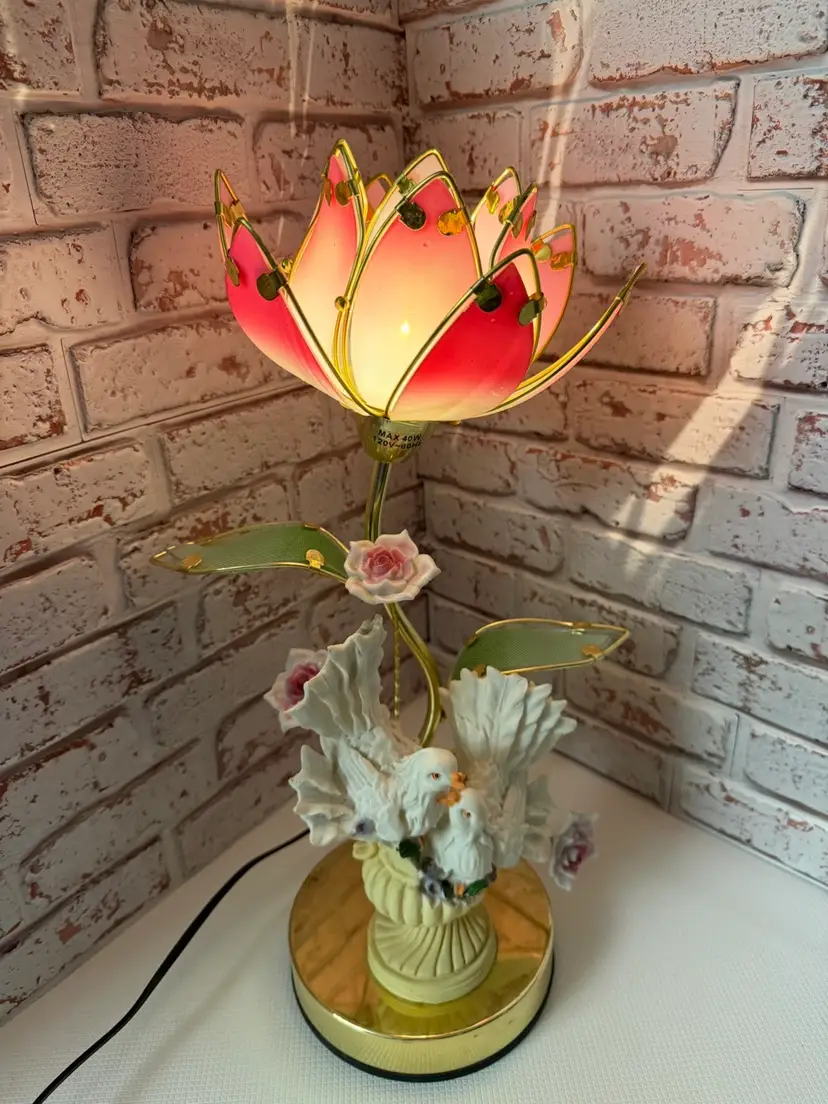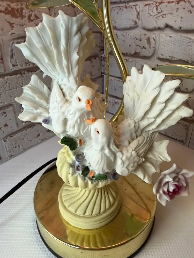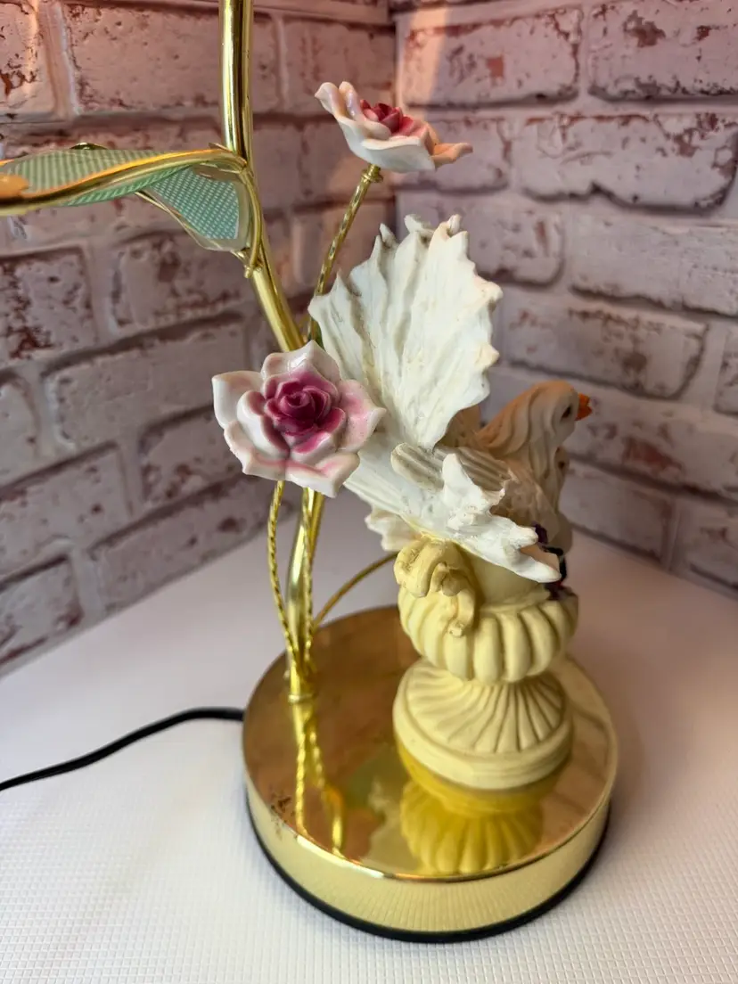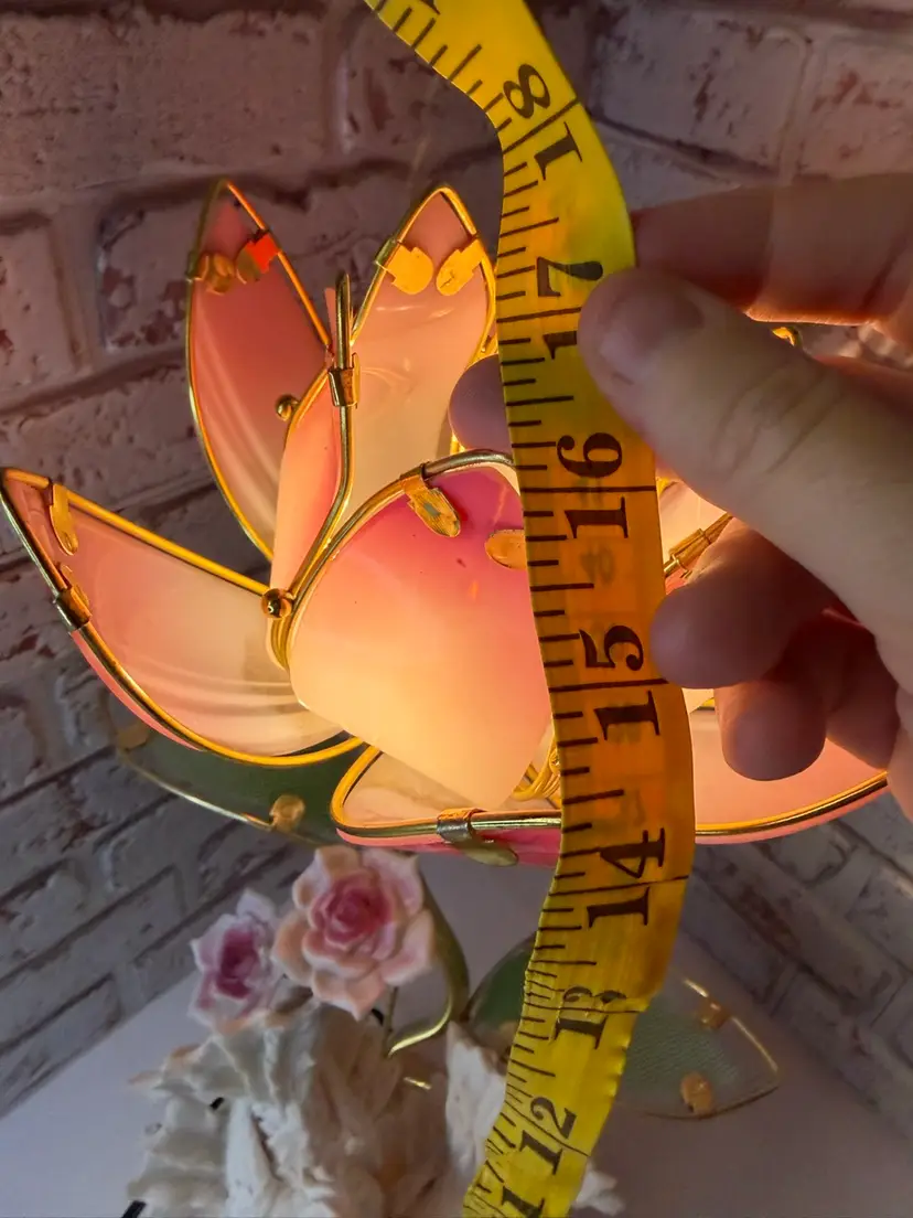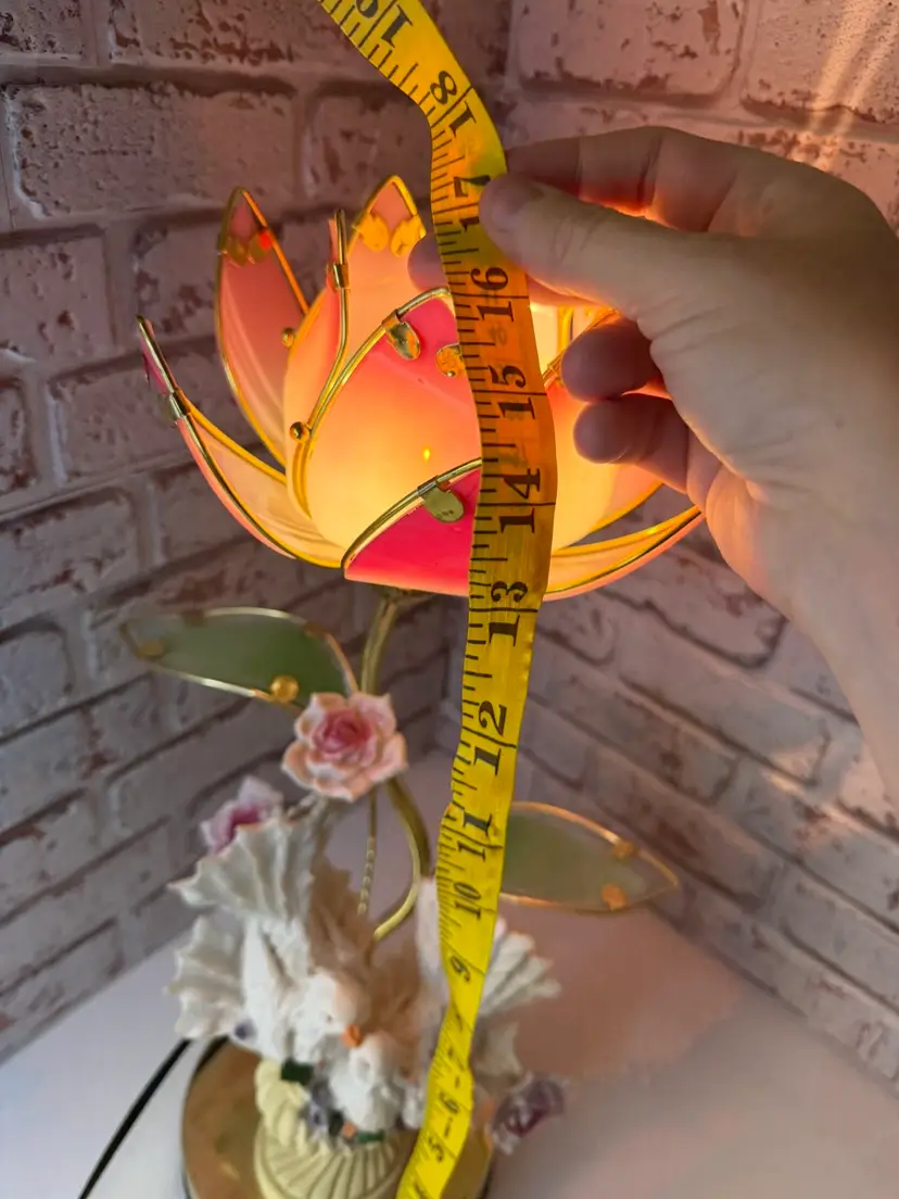 Measures 16” tall and the flower pedals at not not glass there is roughness on the porcelain birds and I did try to clean but it will still have dust on it. And if it a touch lamp you need a different light bulb for it