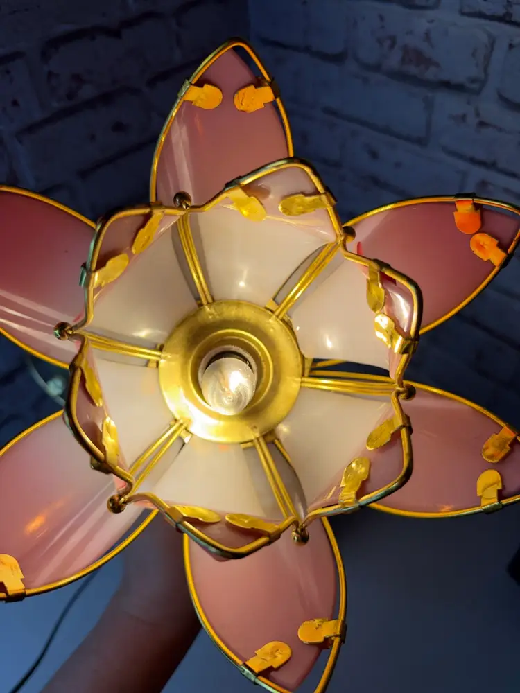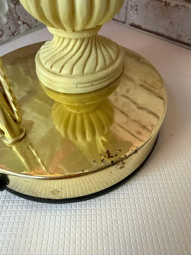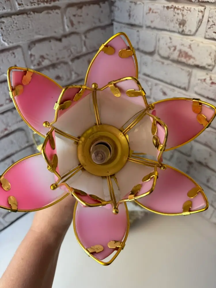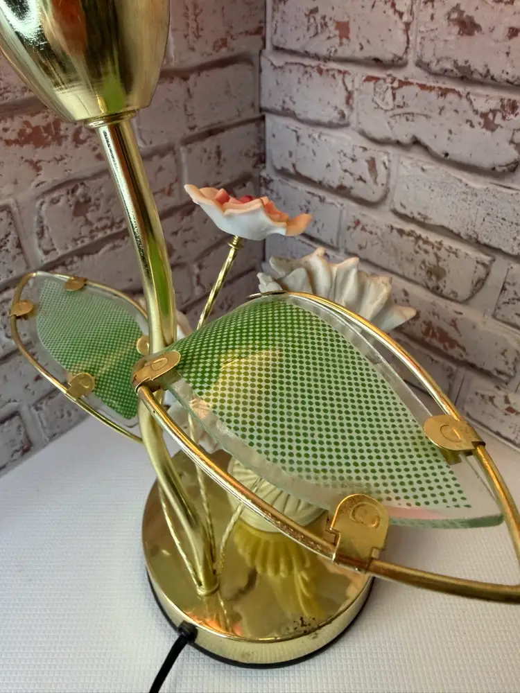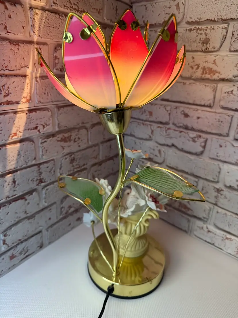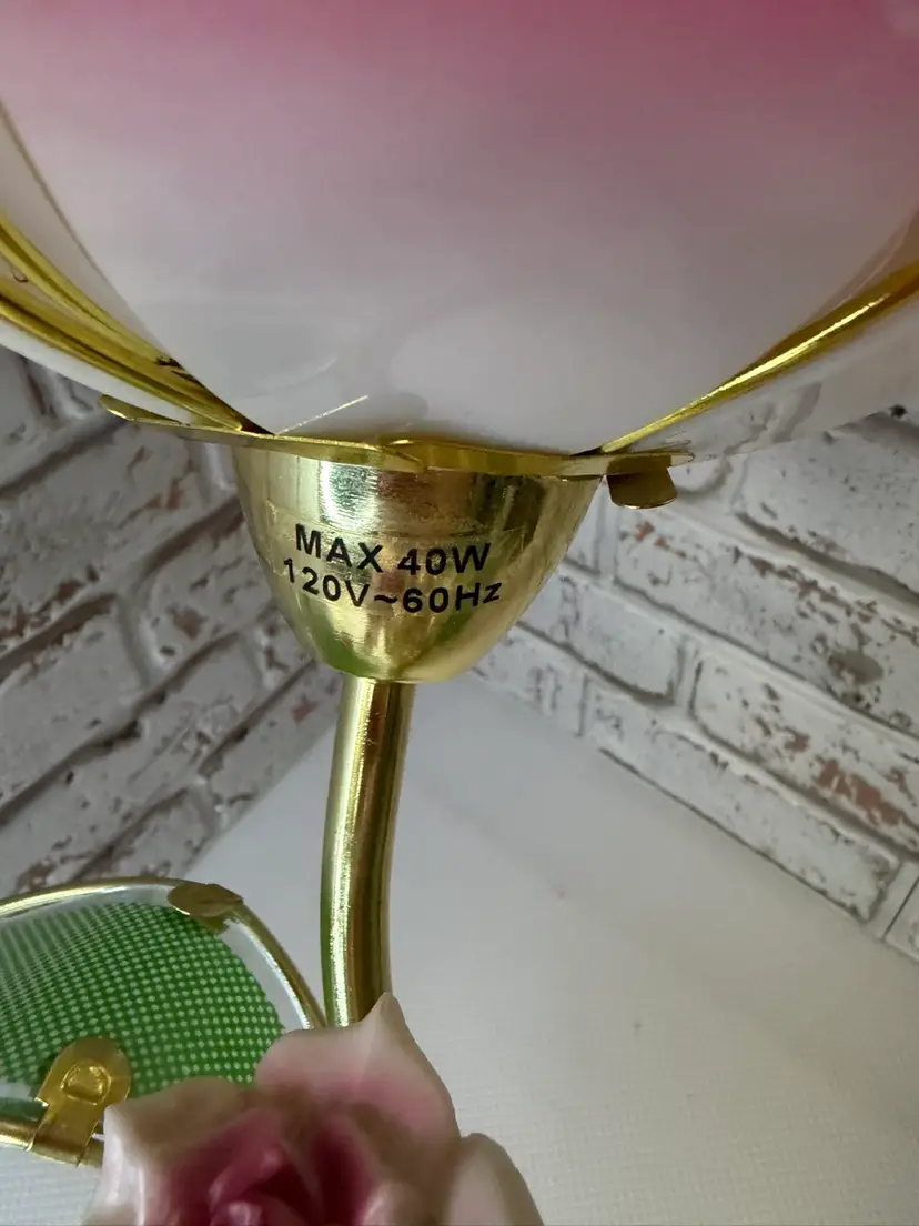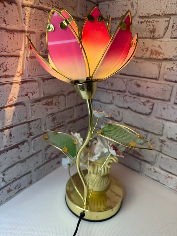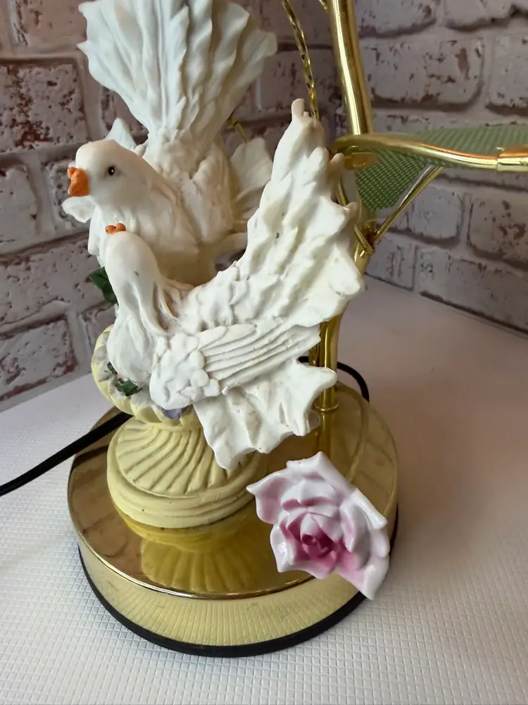Measures 16” tall and the flower pedals at not not glass there is roughness on the porcelain birds and I did try to clean but it will still have dust on it. And if it a touch lamp you need a different light bulb for it