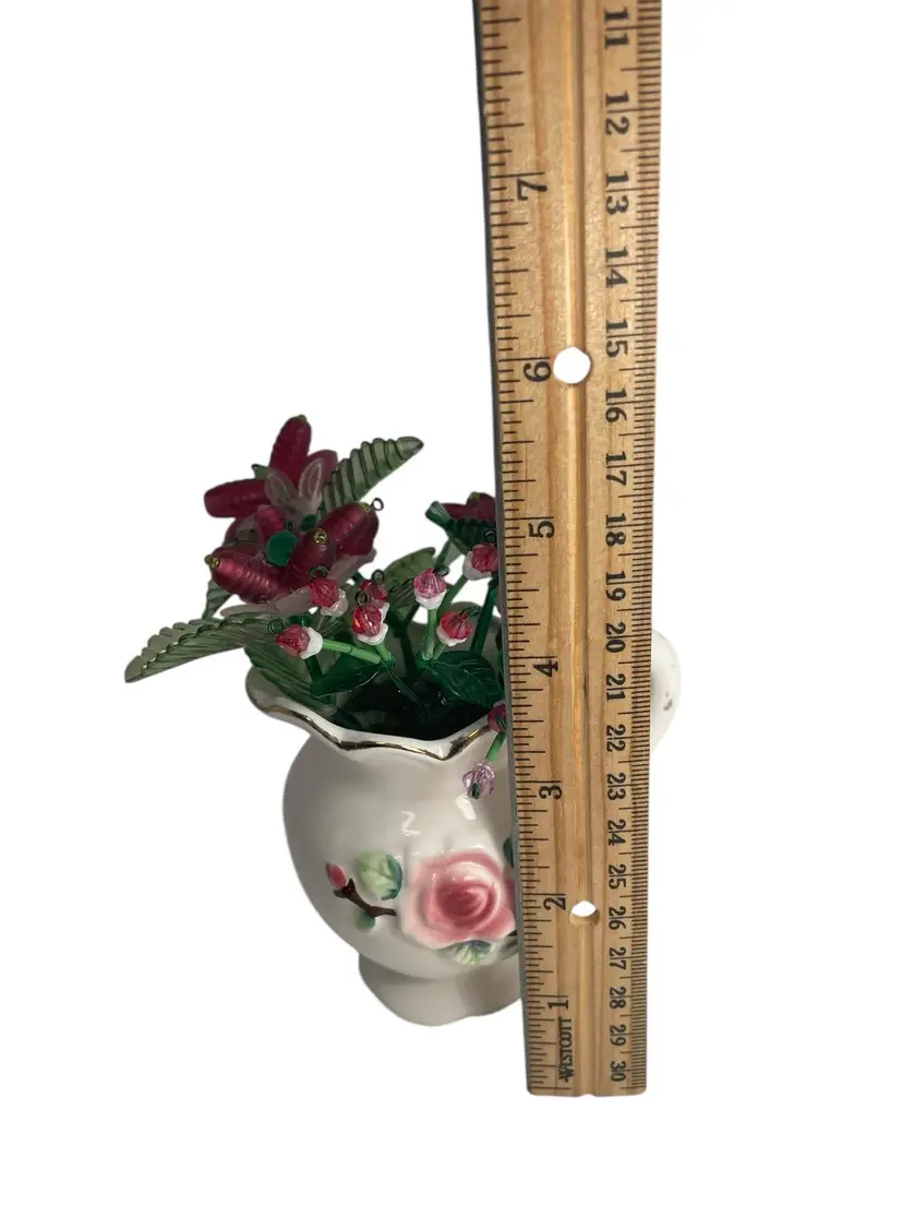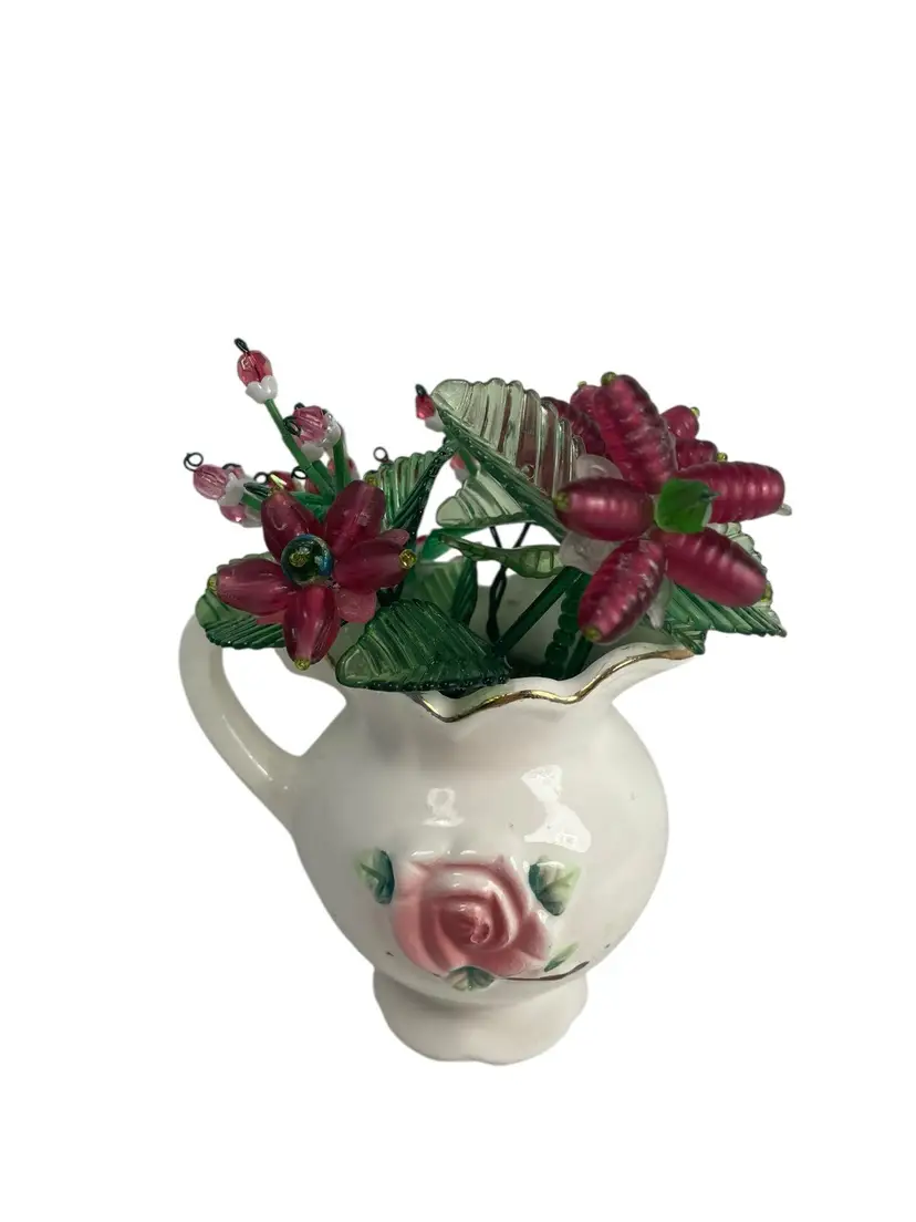 Height 5”, handle to spout 3.75”. Made with beads, acrylic leaves. Creamer bought on Niknax.