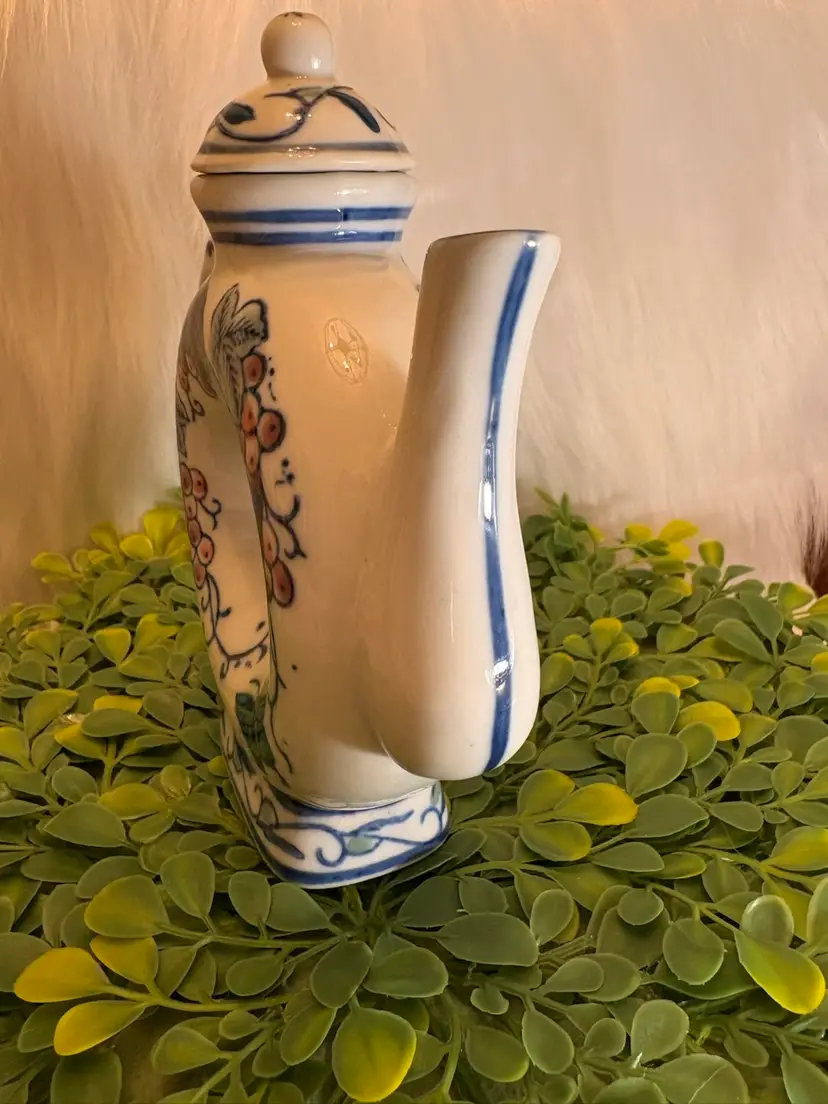 Porcelain Donut Shaped Teapot with Grape & Butterfly Motif 6.5” Vintage