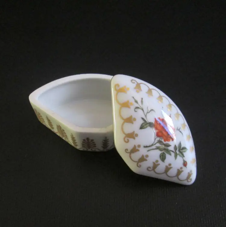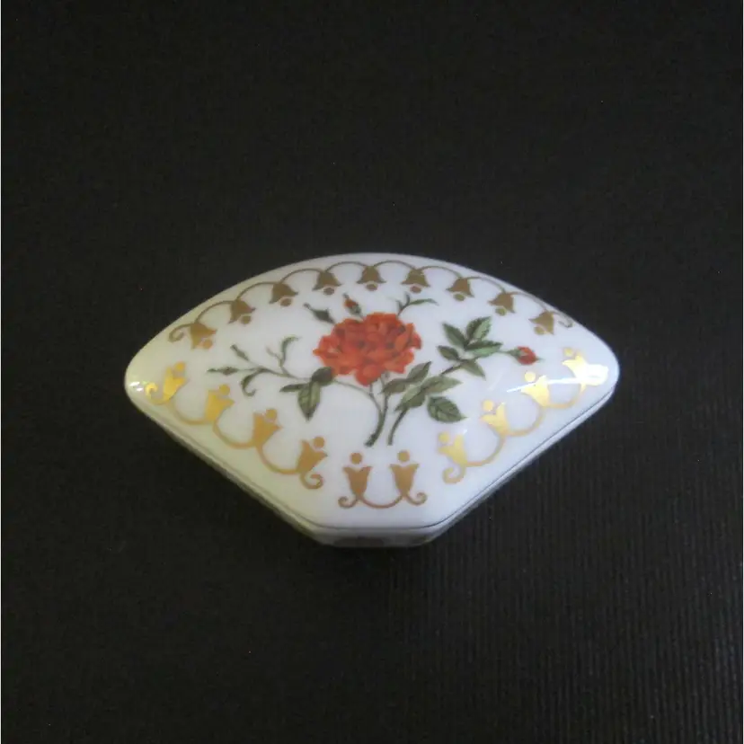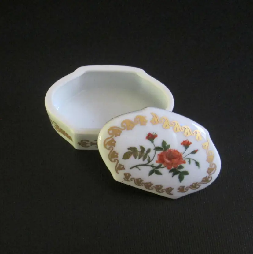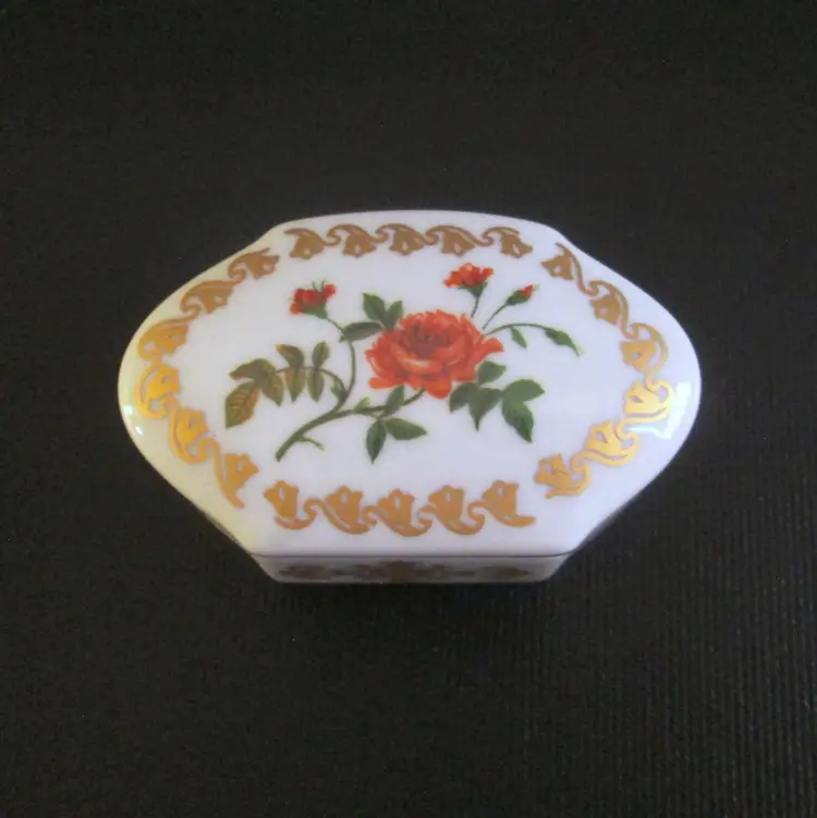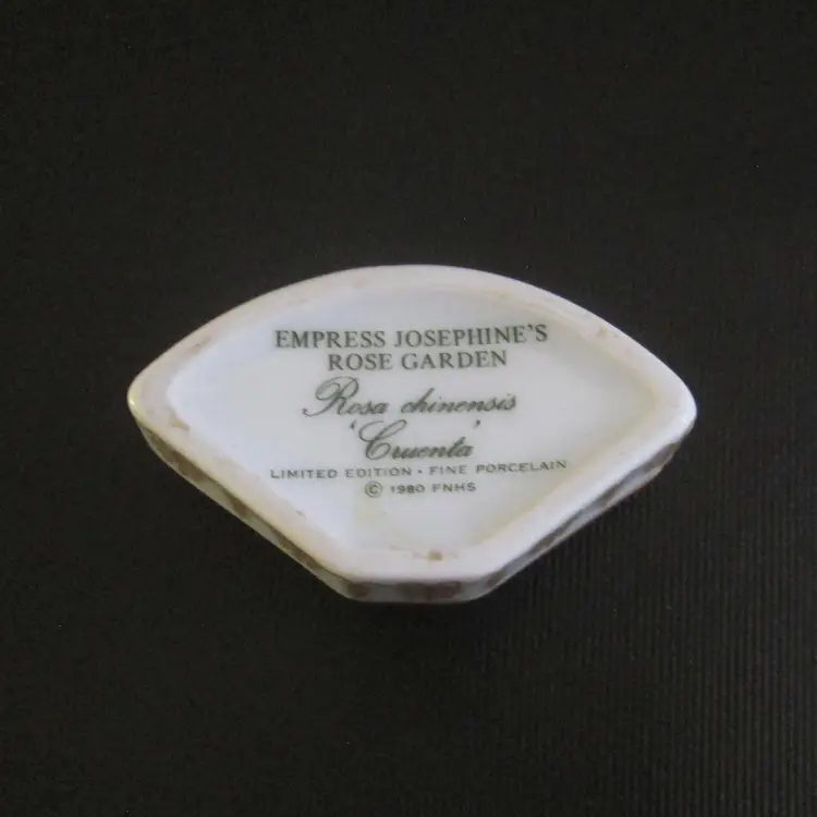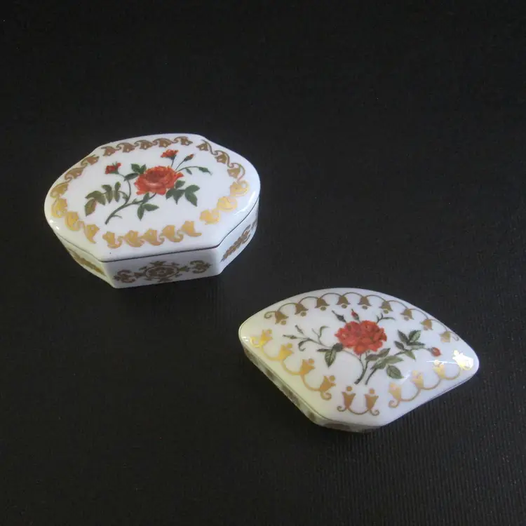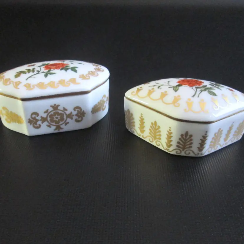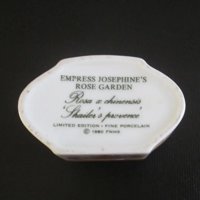 Empress Josephine's Rose Garden trinket box lot. Two limited edition porcelain boxes by FNHS from 1980. Lids have a rose flower and gold paint on sides and lid. Each one is 1 1/2" x 2 1/2" and 1" tall. No chips or scratches.