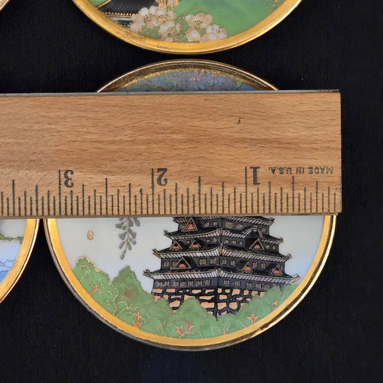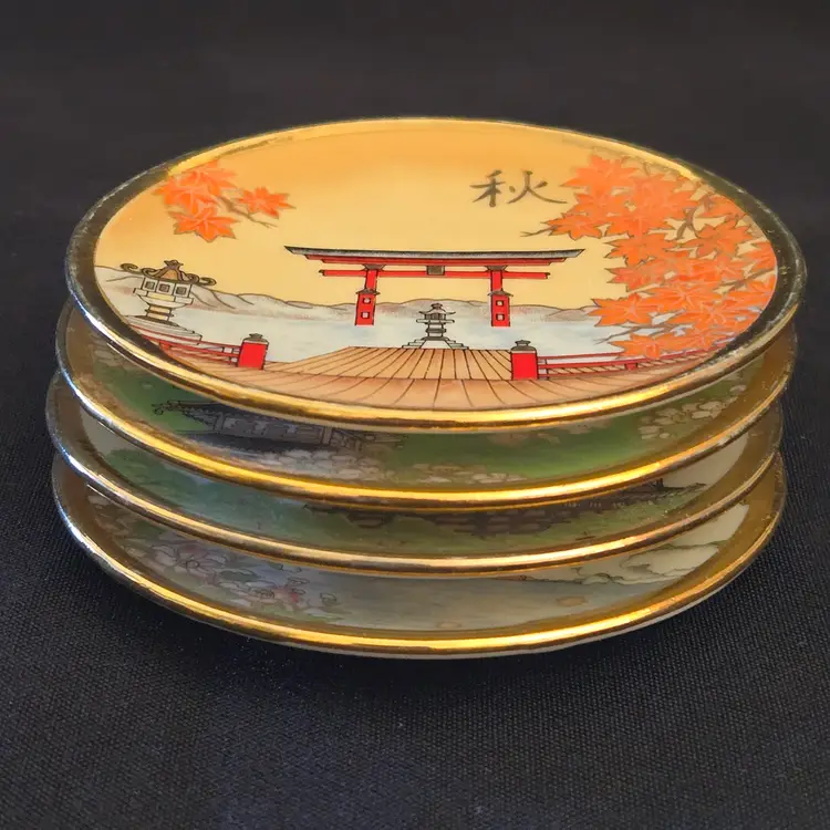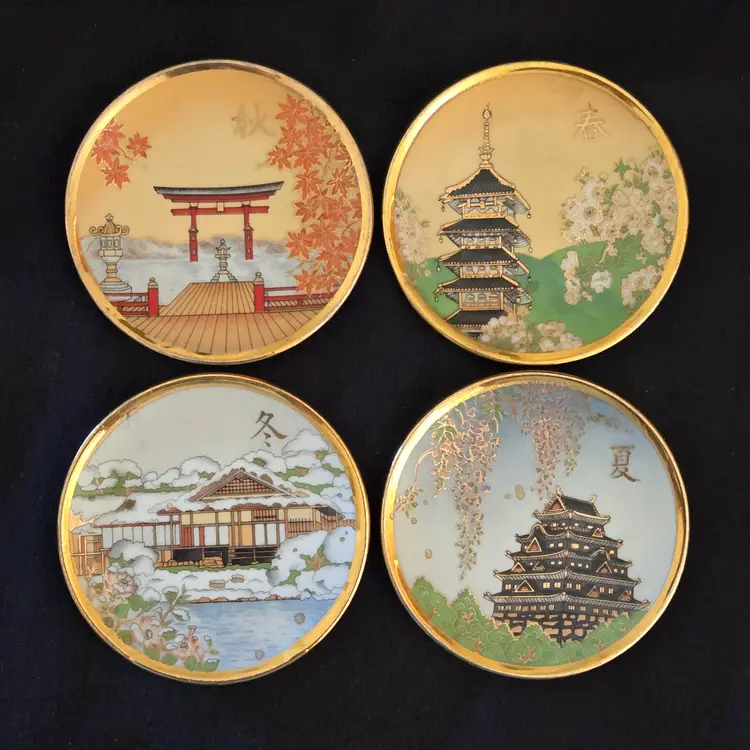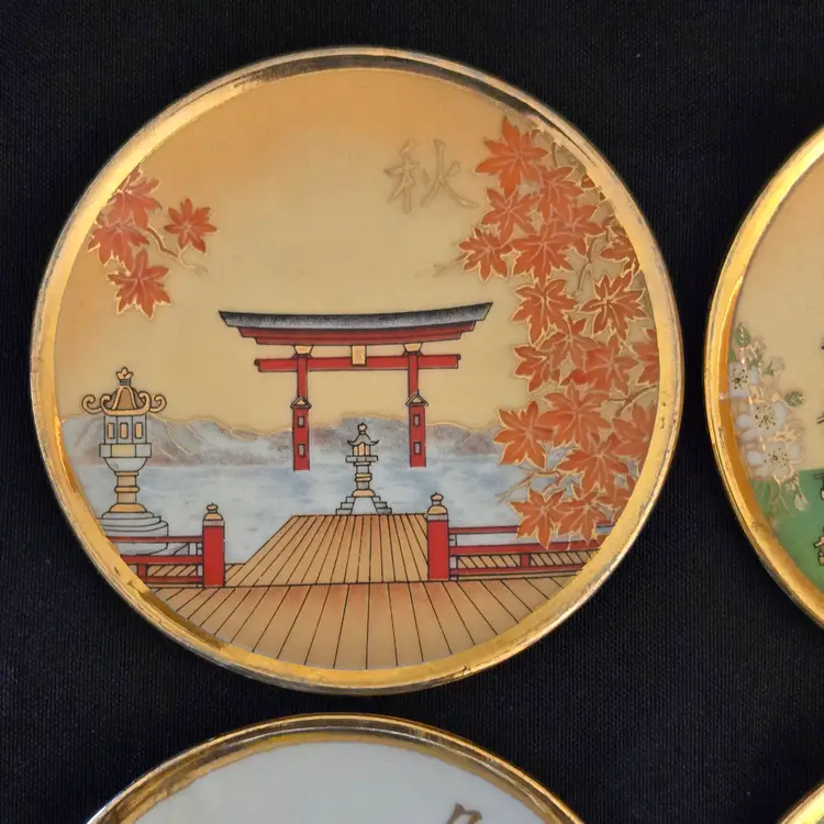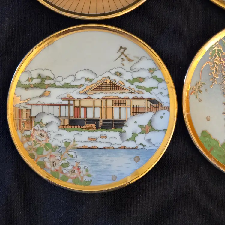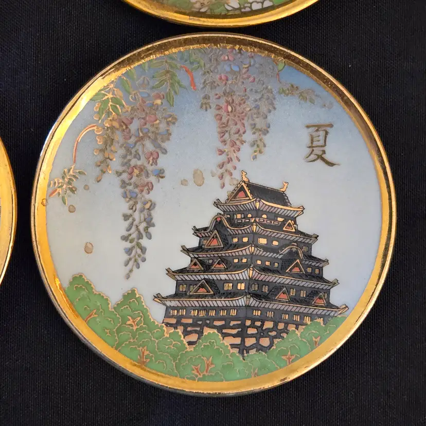 Porcelain Japanese Dipping Plates 4 Temples in 4 Seasons 3" Diameter Gold Trim and unbranded. Used condition with a bit of wear to the gold trim, dirt on the bottoms, slightest bit of wear to the images from stacking, tiny fleabites from use. Please view all the photos and please ask any questions prior to purchase when possible.