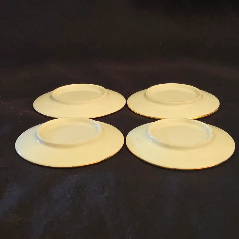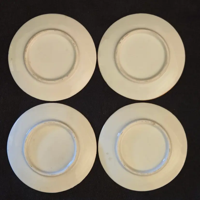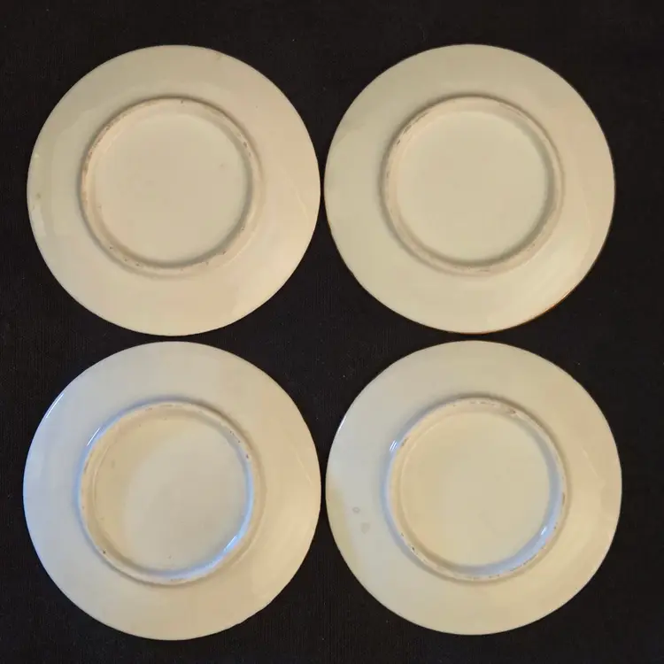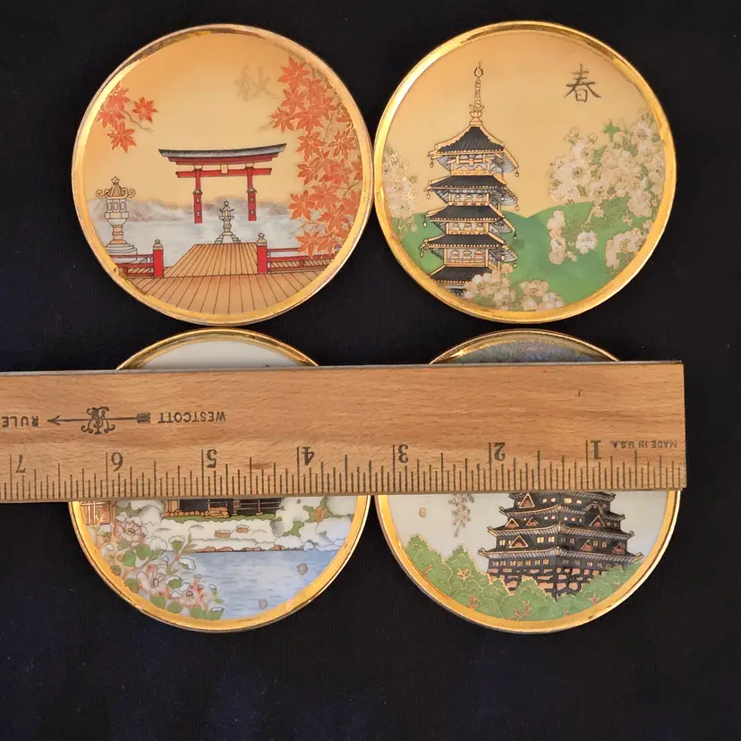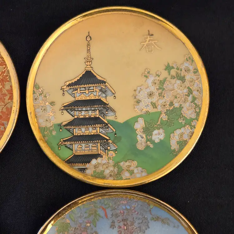 Porcelain Japanese Dipping Plates 4 Temples in 4 Seasons 3" Diameter Gold Trim and unbranded. Used condition with a bit of wear to the gold trim, dirt on the bottoms, slightest bit of wear to the images from stacking, tiny fleabites from use. Please view all the photos and please ask any questions prior to purchase when possible.