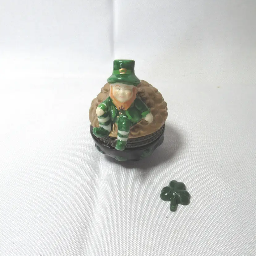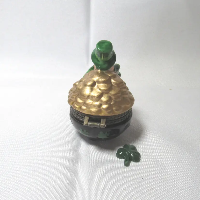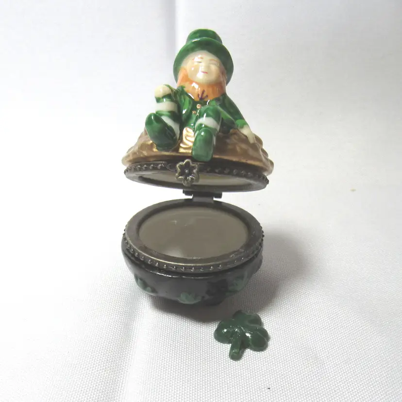Porcelain Leprechaun on Pot of Gold Hinged Trinket Box w/ Shamrock Trinket New old stock 2.75" tall