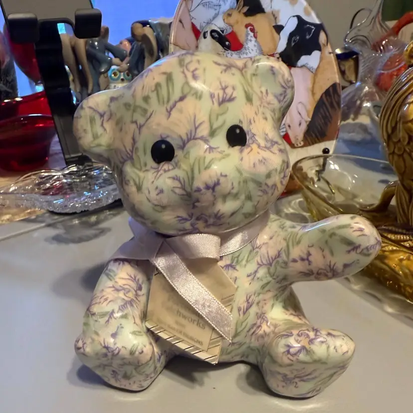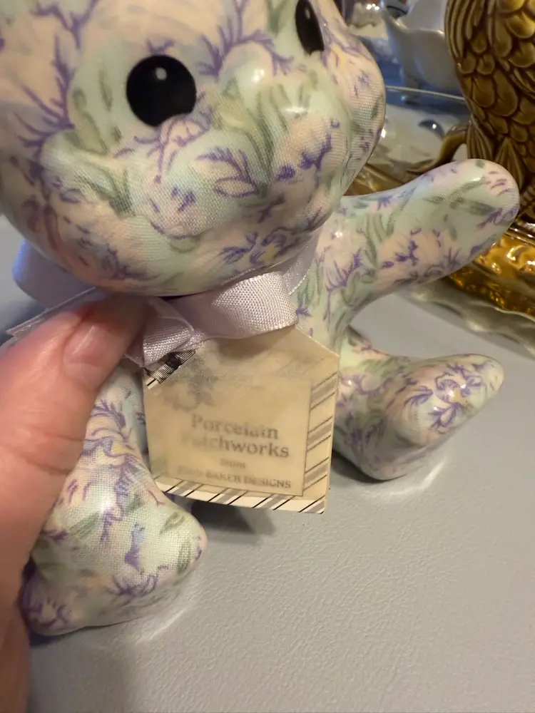 Beautiful porcelain with decoupage of lilac flowers and mint green leaves. 6in high. Neck ribbon and tag intact. Excellent condition!