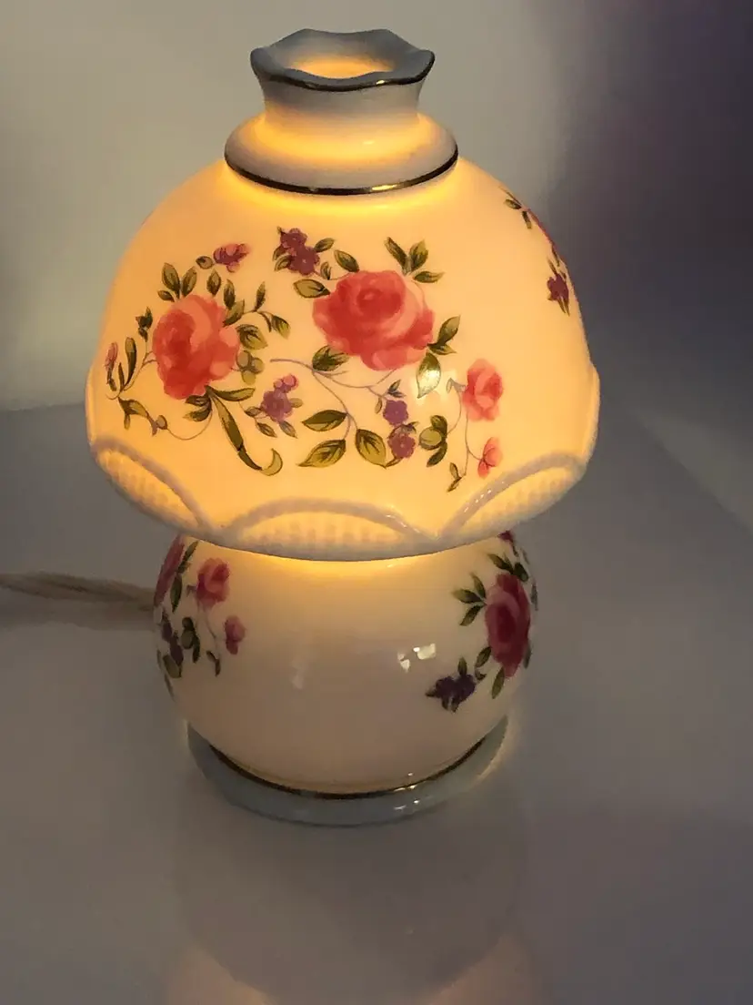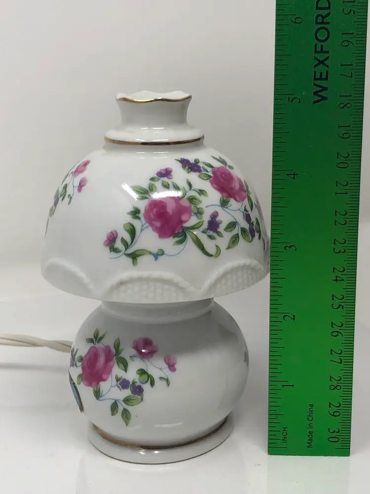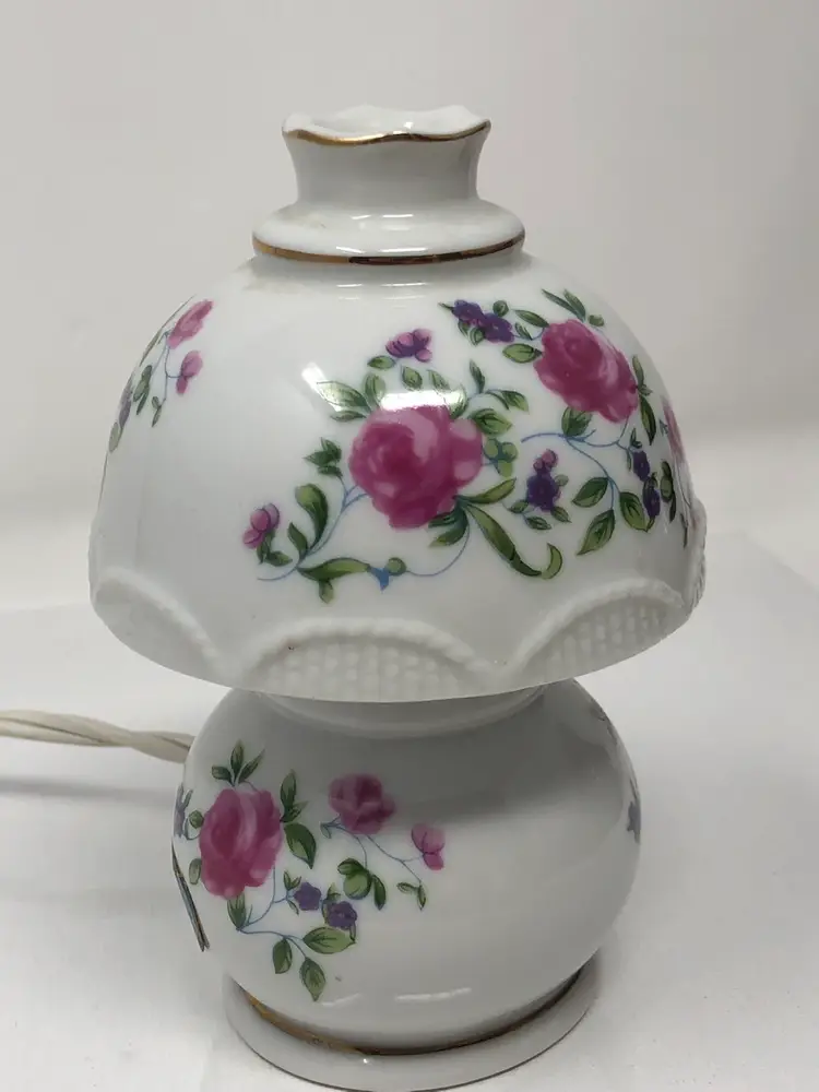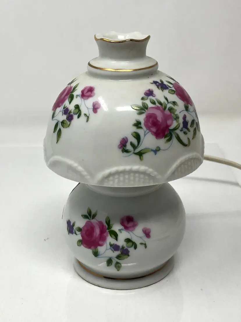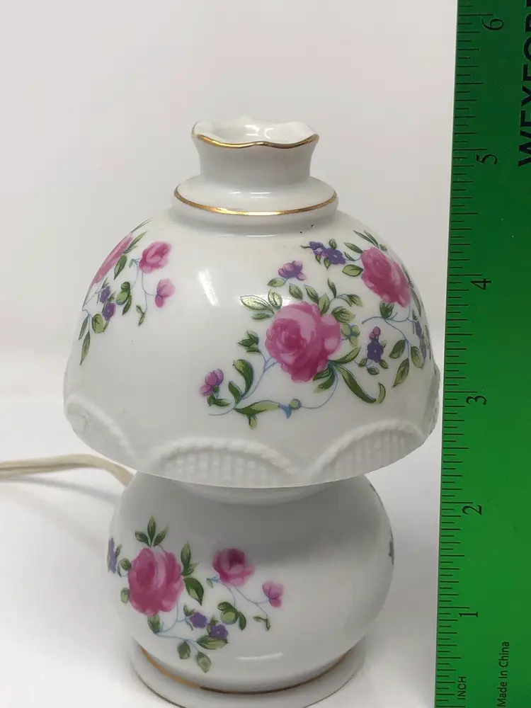 5" mini portable lamp with pretty pink rosebud design. Gold painted details and scalloped 'shade' trim. Original UL light fixture in working condition. No chips or cracks, original labels