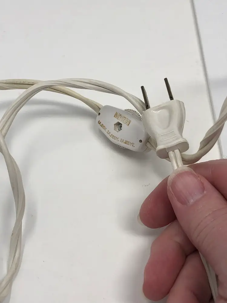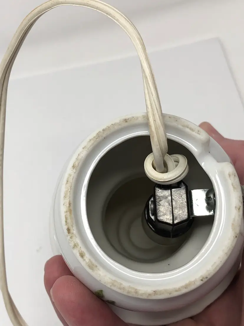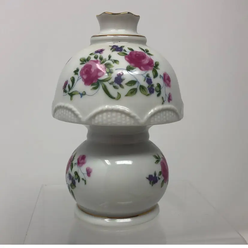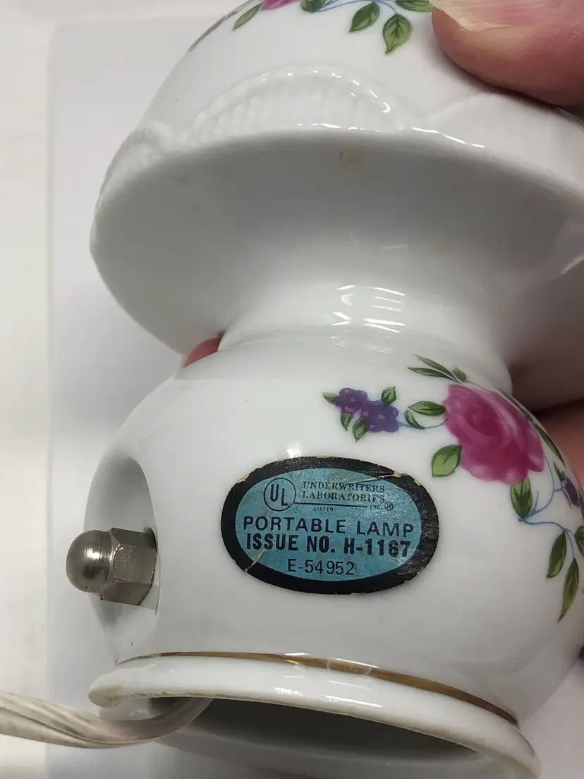 5" mini portable lamp with pretty pink rosebud design. Gold painted details and scalloped 'shade' trim. Original UL light fixture in working condition. No chips or cracks, original labels