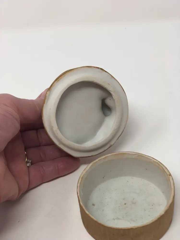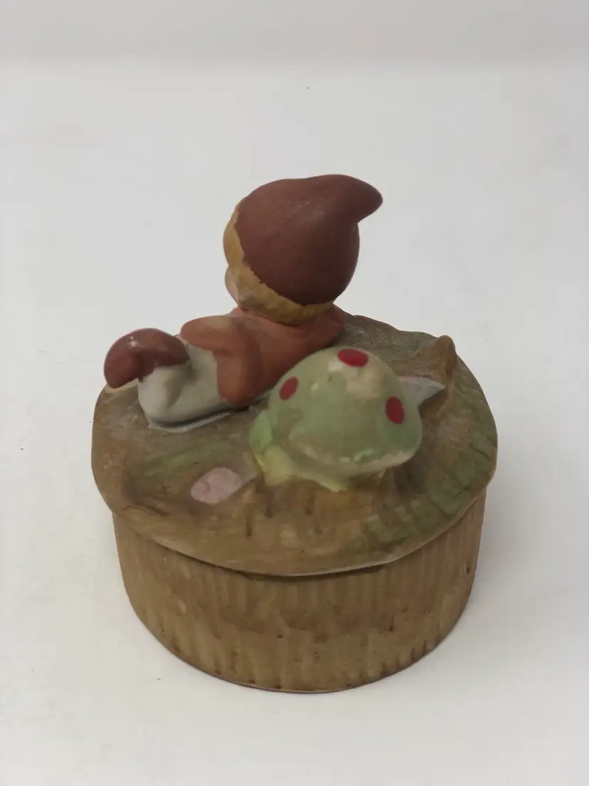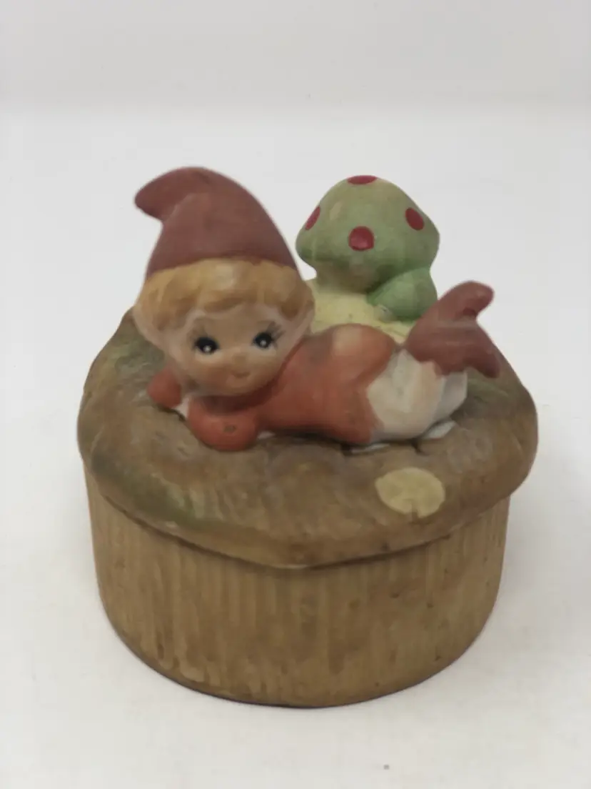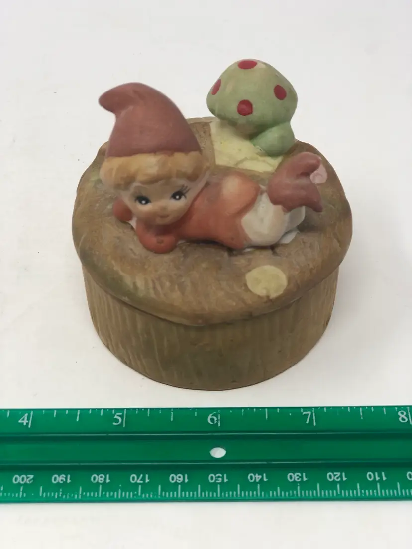 Pretty pixie posing on top of this lidded trinket box numbered on the bottom. Almost 3" wide with no chips or cracks. And A Jewelry Surprise!