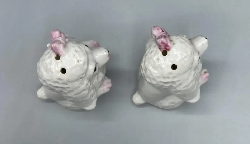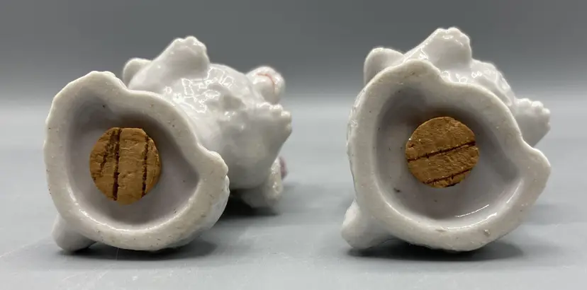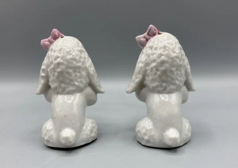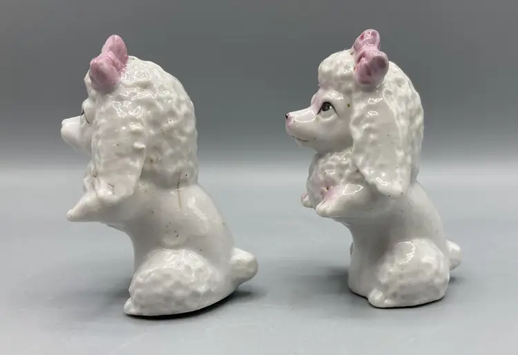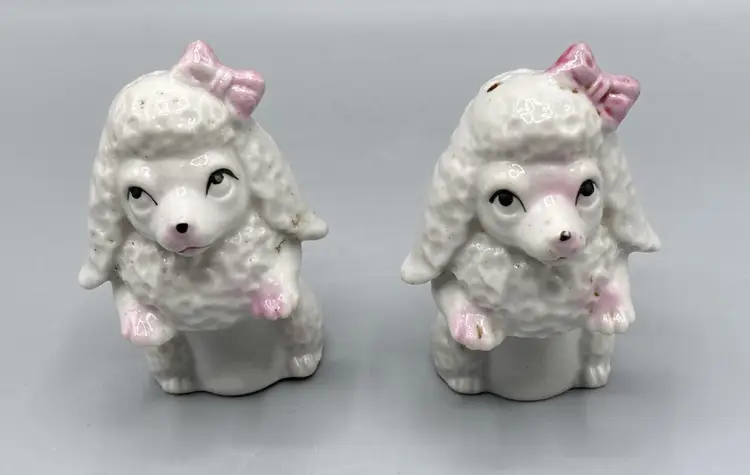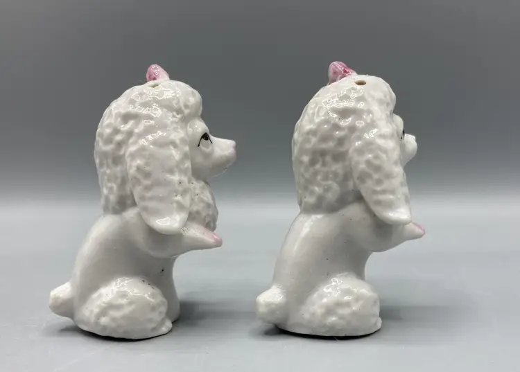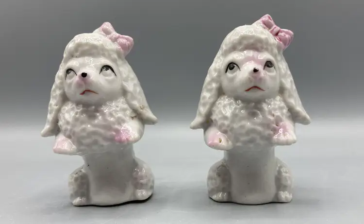 These poodle shakers are in good overall condition. They do have some discoloration in some spots, visible in pictures. They both have their original corks. Each measures approximately 2 3/4" tall x 1 3/4" x 1 1/2".