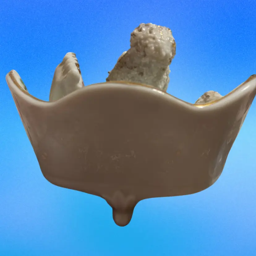 This is a vintage Japanese porcelain spaghetti poodle figurine on a couch.