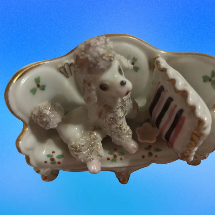 It features a white poodle with a textured, "spaghetti" or "sugar" glaze on its fur, sitting on a couch decorated with holly-like decals and gold trim.