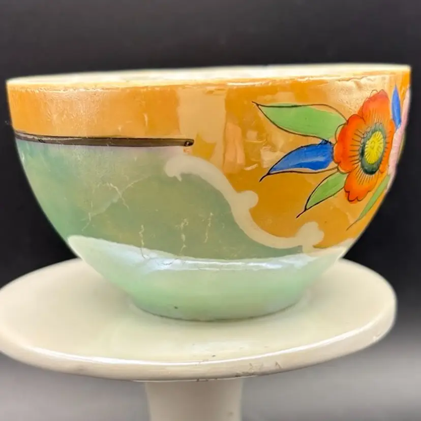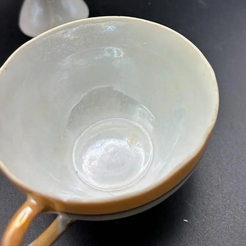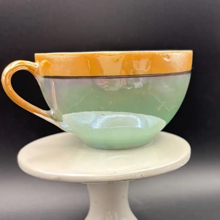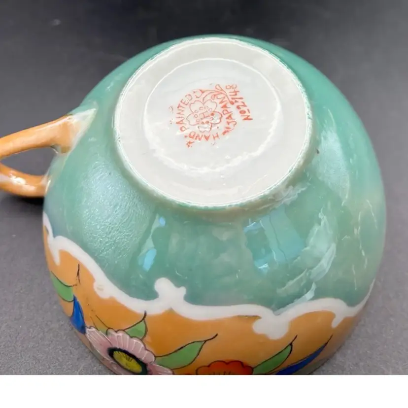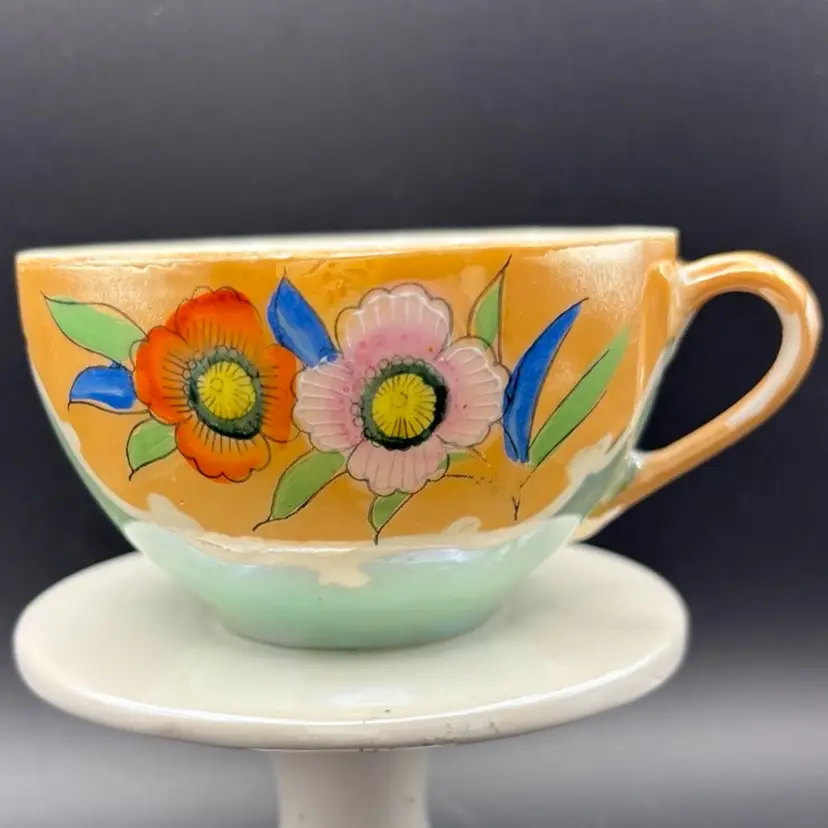 The image shows a vintage Japanese hand-painted porcelain teacup with a peach luster finish and floral design. The marking "HAND PAINTED NIPPON No2748" indicates it was made before 1921 when "Nippon" was replaced with "Japan" on exported items. Porcelain with a luster glaze, which gives it an iridescent, metallic sheen. Design: Hand-painted floral motifs in orange, pink, yellow, blue, and green Condition: Vintage items may have minor imperfections like chips or fading paint.