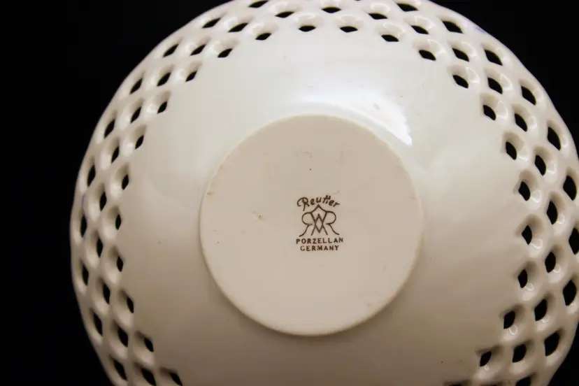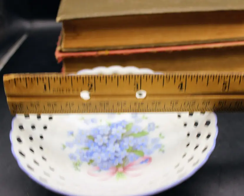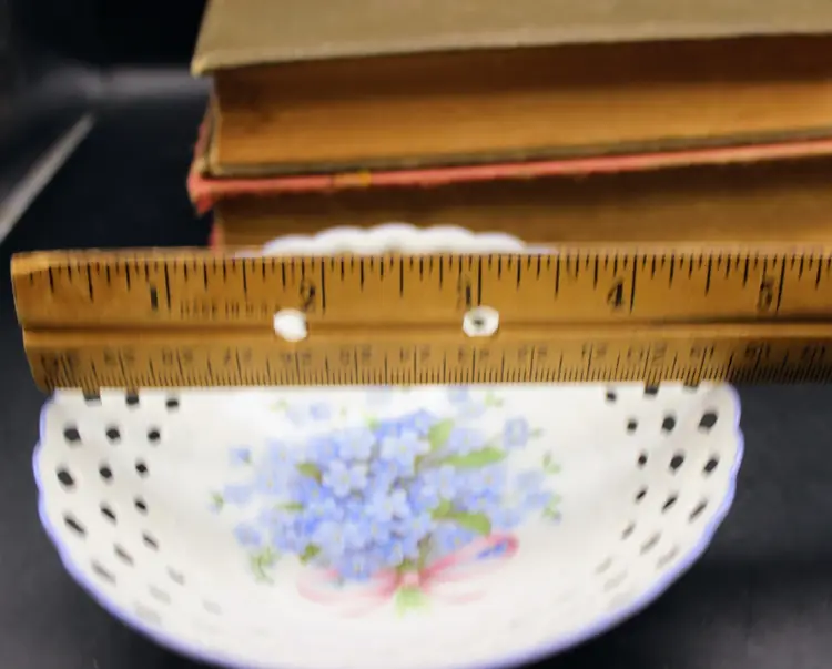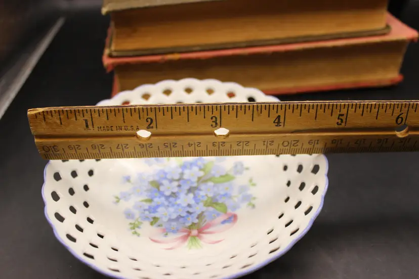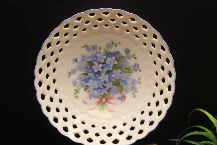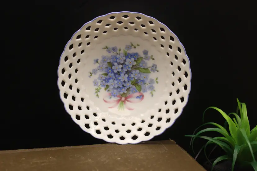 Fine Porcelain Trinket Dish with Cute Blue Forget Me Not flowers. Open cut pattern edge. Made in Germany. Excellent Condition VTG Approximately 5" round NTS: 1/15/25 TC5