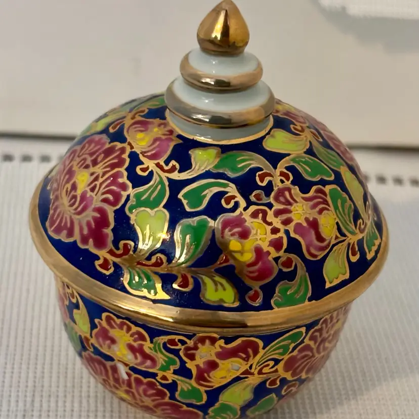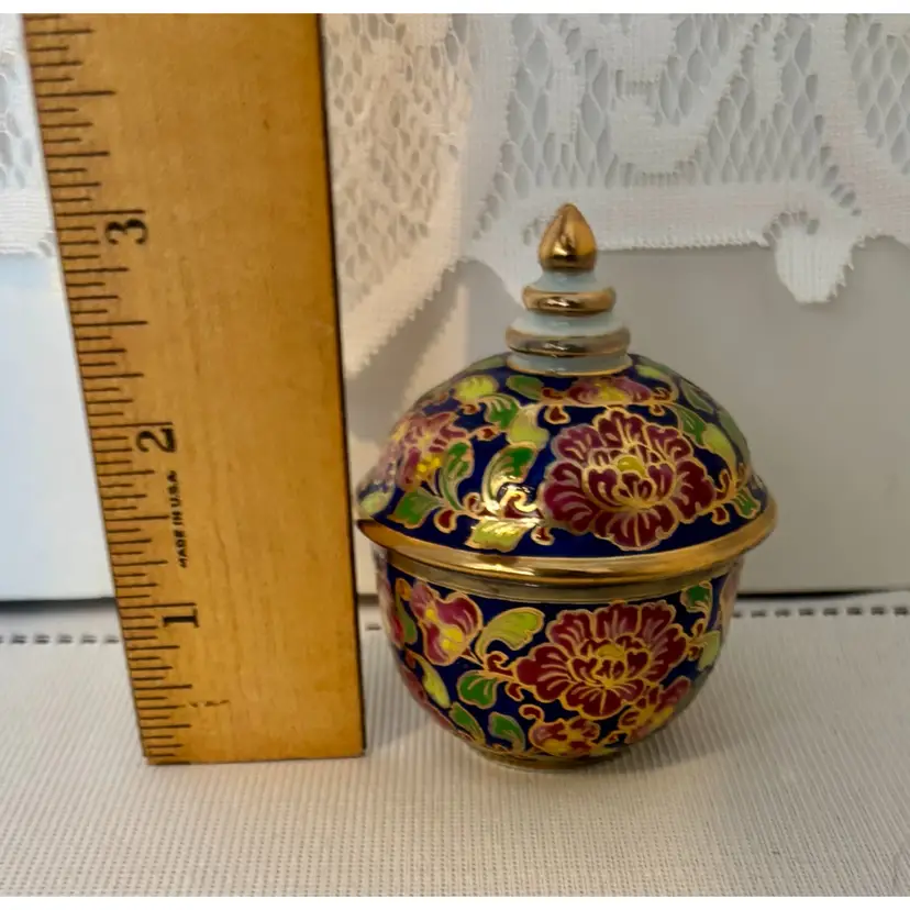 Approx. 3” Small Vintage Japanese Porcelain Covered Jar trinket box multicolor gold trimming mini hand painted Enamel No chips or cracks