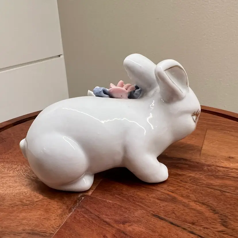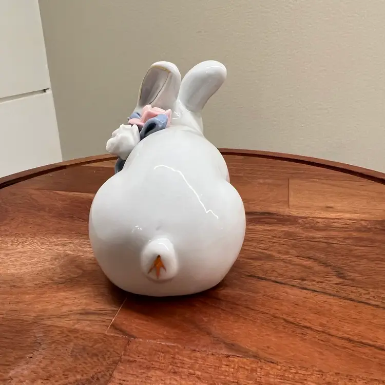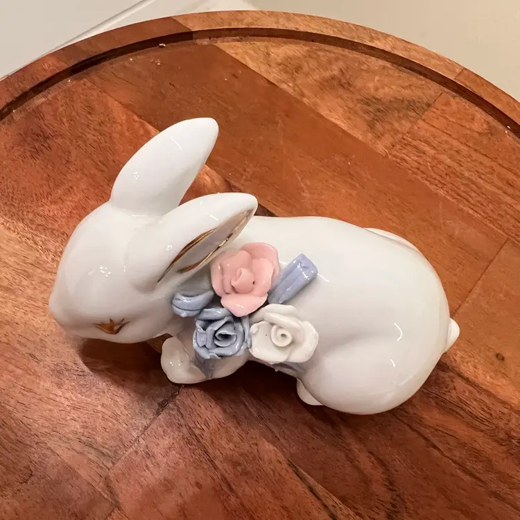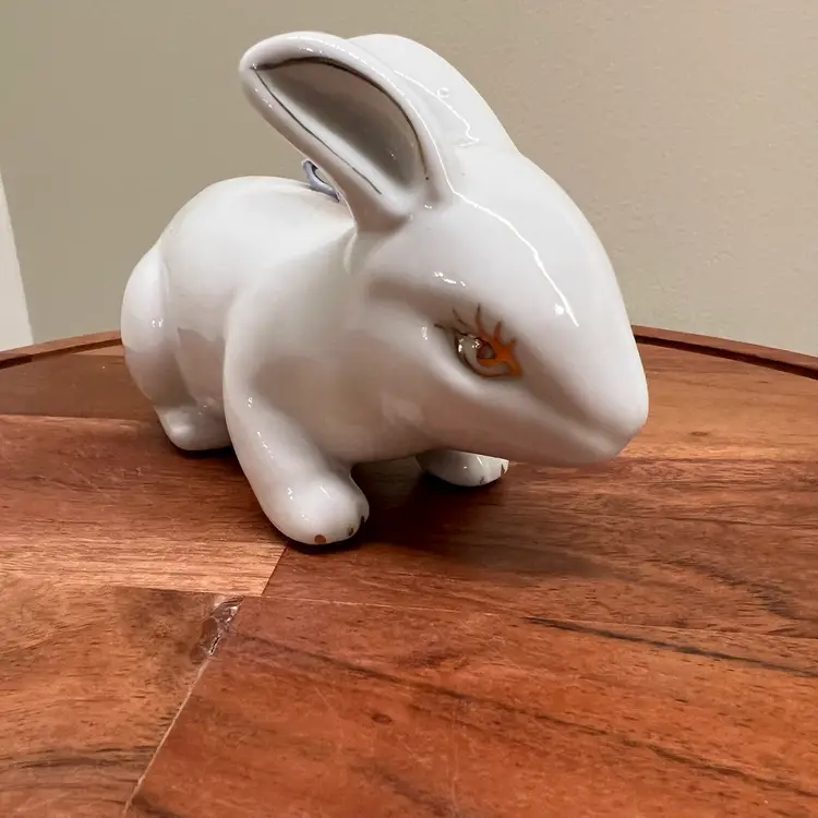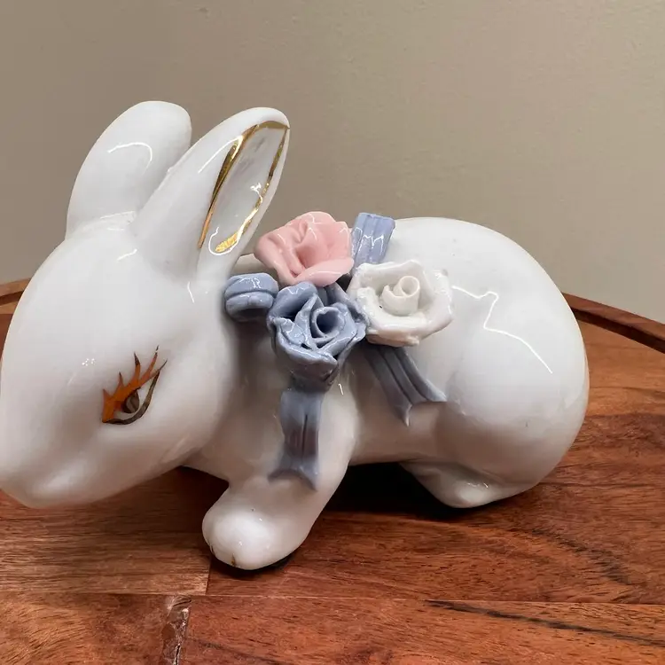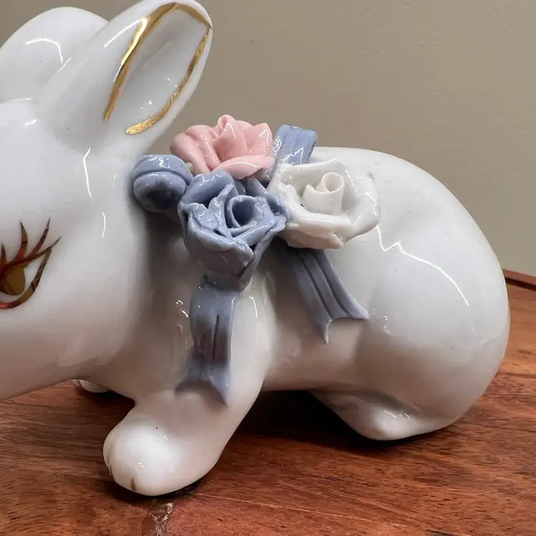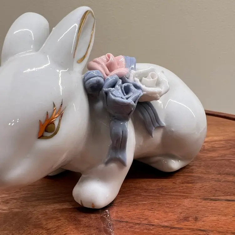 Adorable vintage porcelain bunny rabbit with flowers and a ribbon. Gold accents painted on the ears, eyes, toes and tail. Excellent condition!