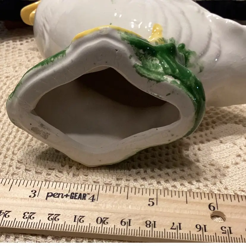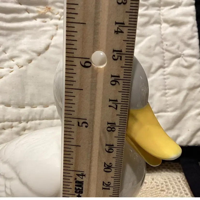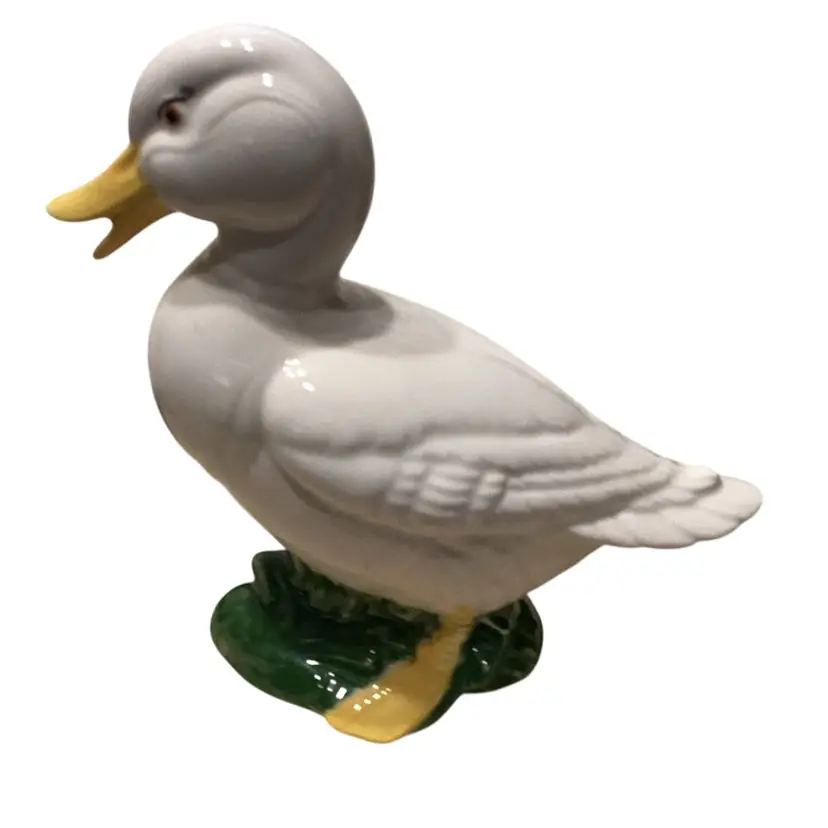 Porcelain white duck with yellow beak and yellow feet on a blade of grass see pictures for the measurements. It’s got pretty eyes.
