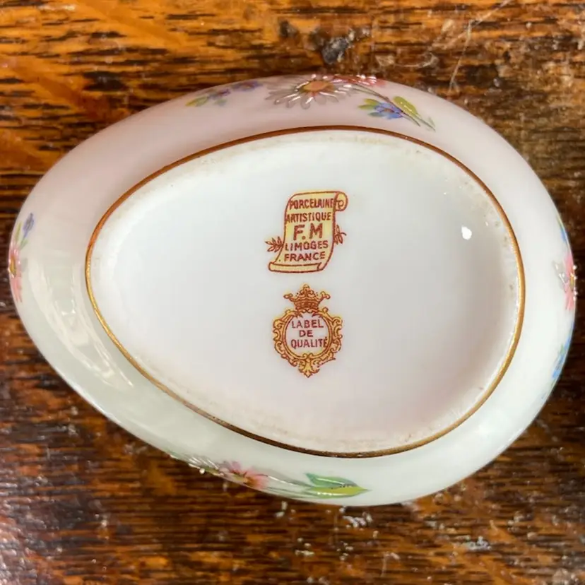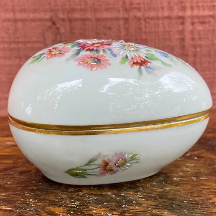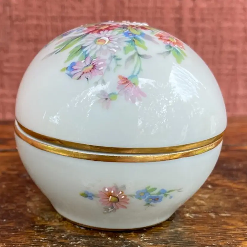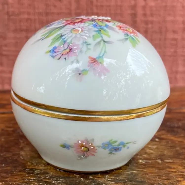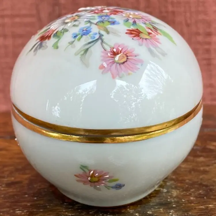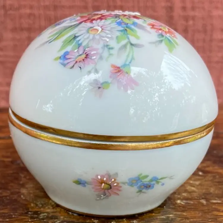 Approx 3.5”l x 2.5”h. Pre-owned. 2 small chips along inside of cover’s lip. See all images as part of description.