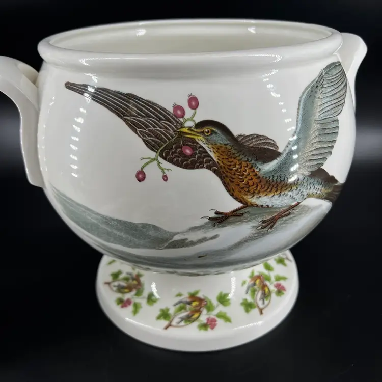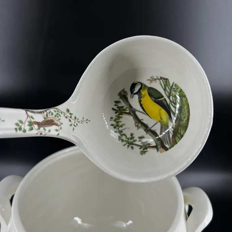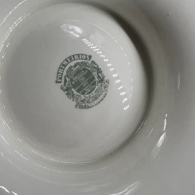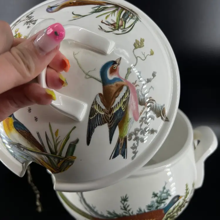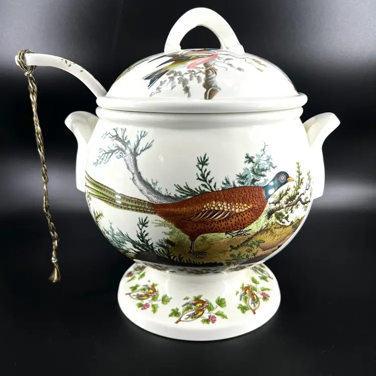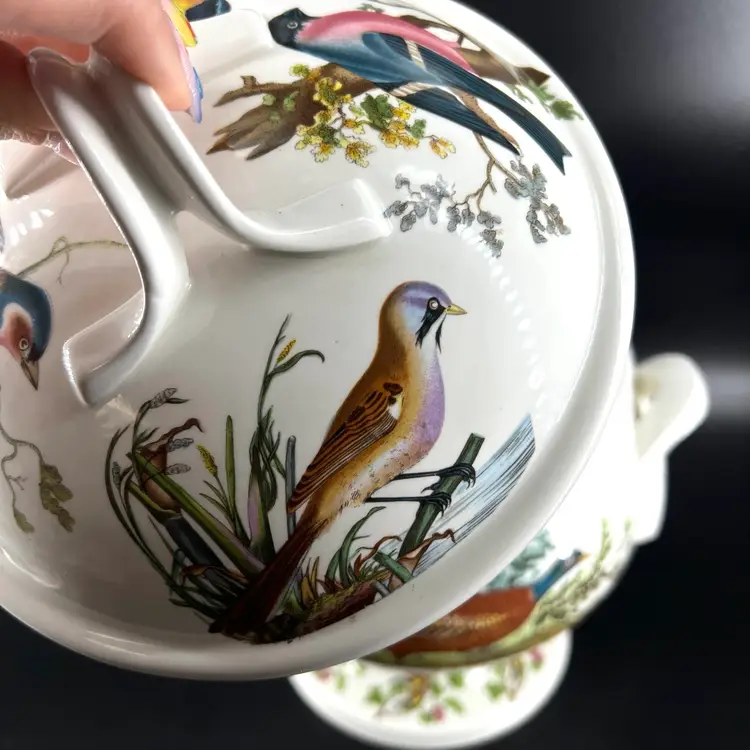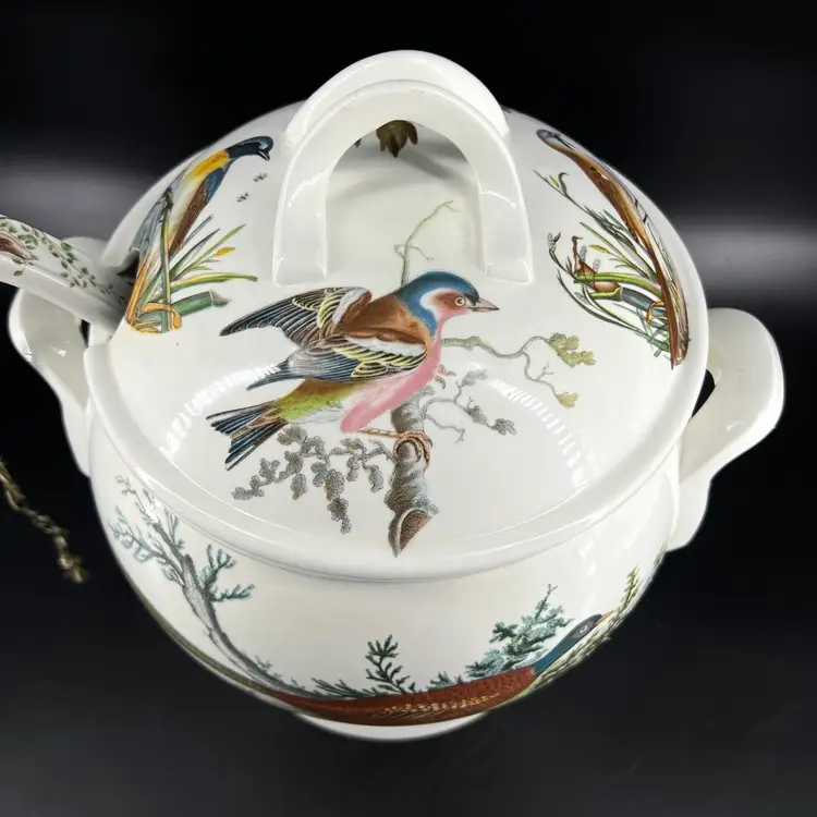 This soup tureen is attributed to Portmeirion. It features Birds of Britain and measures approx 12” tall and 11” wide. There are no chips or cracks.