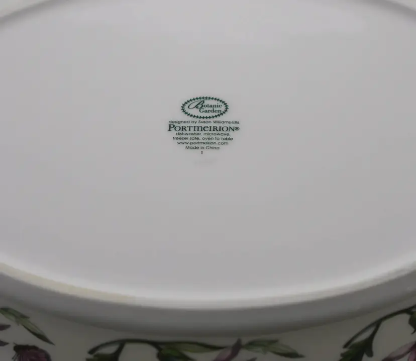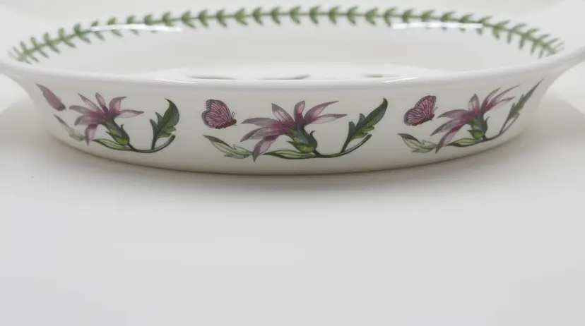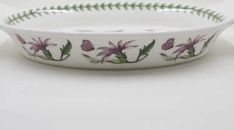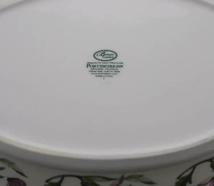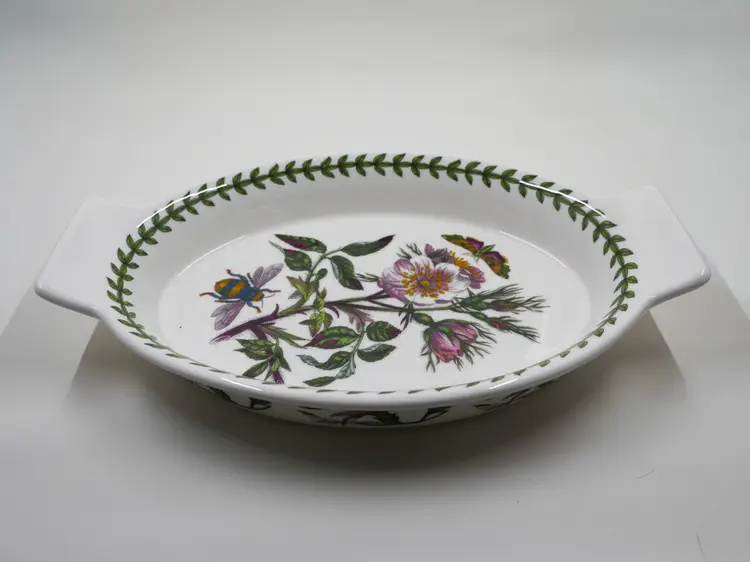 An oval dish with a shallow, slightly curved form, featuring the iconic "Botanic Garden" pattern. The flowers are a Dog Rose and Treasure Flower, combination with a bee and butterfly. The bottom is marked "Botanic Garden designed by Susan Williams-Ellis, Portmeirion and Made in China." Approx. size: 10" wide (with handles) x 1.5" tall. In excellent condition, no issues.