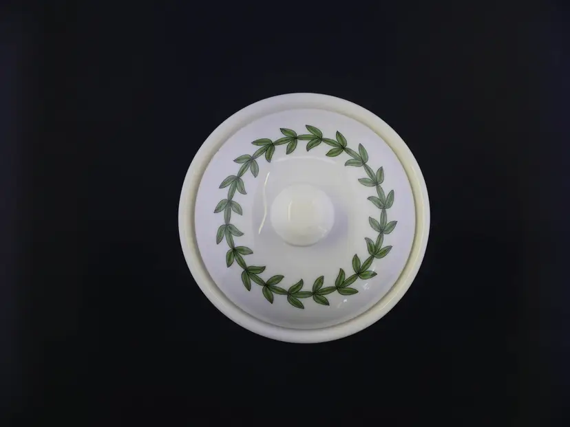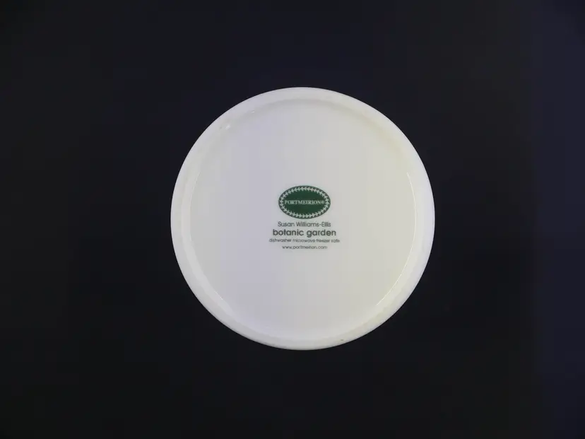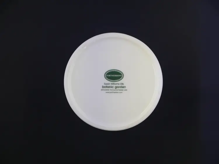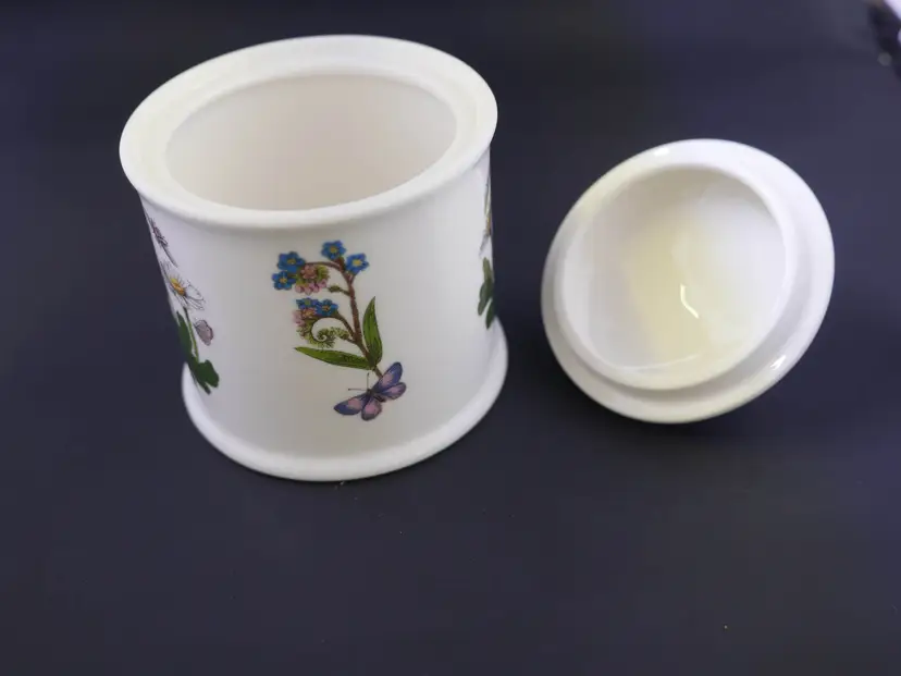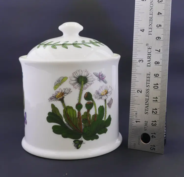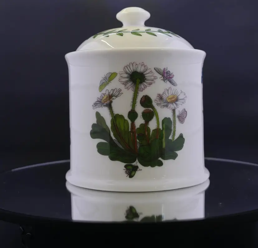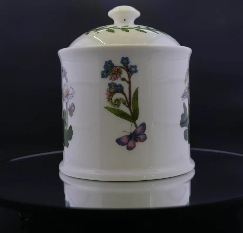 A cylindrical ceramic jar with a fitted lid, part of the Botanic Garden collection by Portmeirion. The base is marked with the Portmeirion stamp and Susan Williams-Ellis Botanic Garden, along with care instructions. The jar and lid are in excellent condition with no issues. The approx. size is 3.5" wide x 4.5" tall with knob.