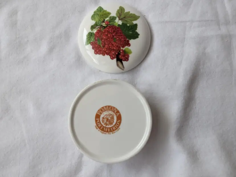 Portmeirion Pomona Red Current Round Trinket Box with Lid Design: Fruit And Flowers, White Pattern discontinued. Produced 1983 - 2020