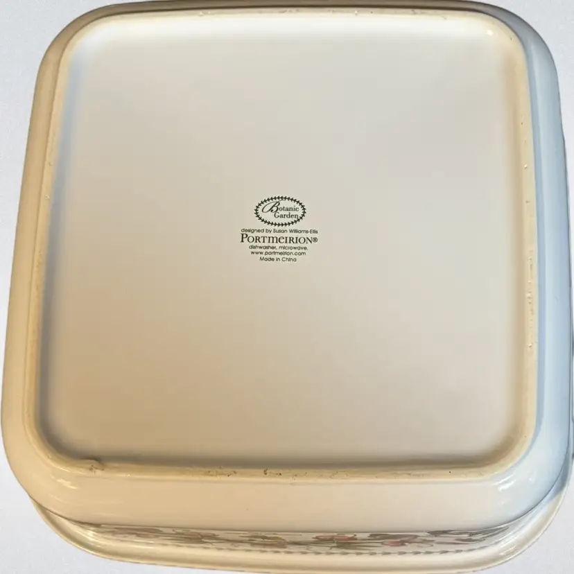 As pictured in last 2 photos (which are hard to see) the lid reads: “POSTMEIRION” and “Dishwasher safe. Microwave and oven safe without lid.”