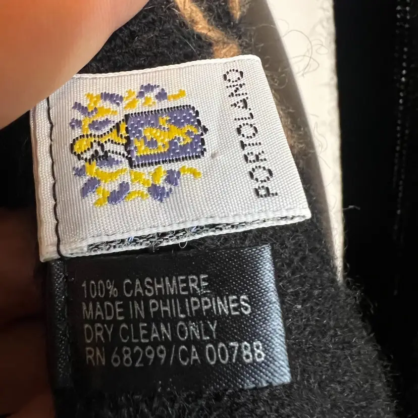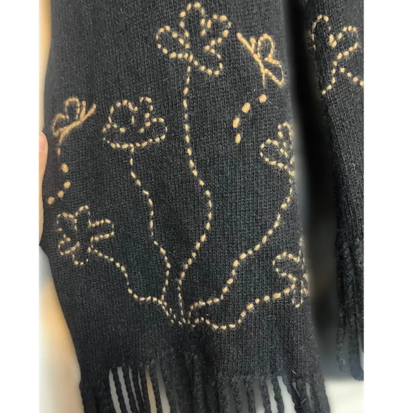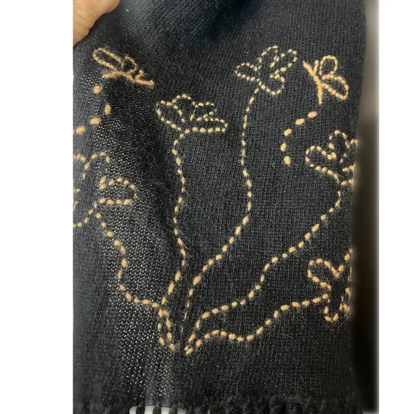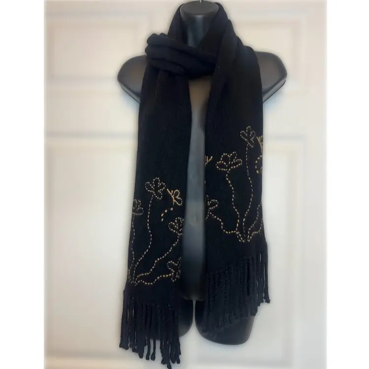 Chic black scarf adorned with a pretty butterfly garden. Perfect for a stylish touch. About 72” long + 4 1/2” tassel an 12” wide.