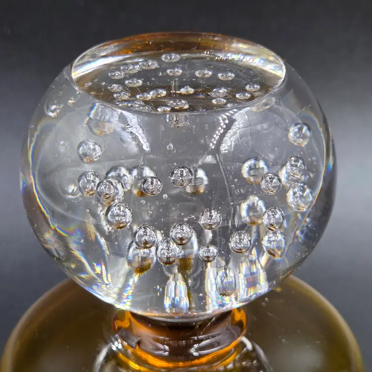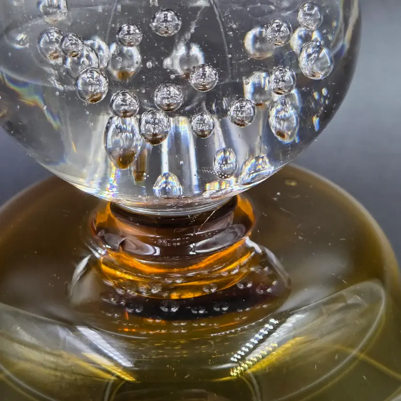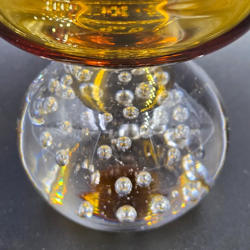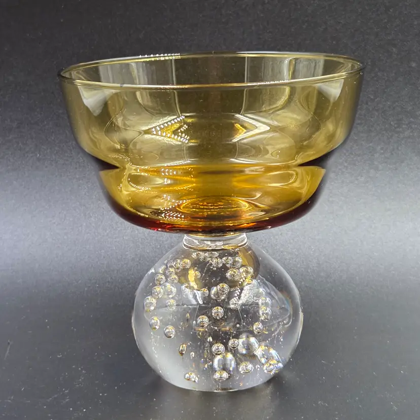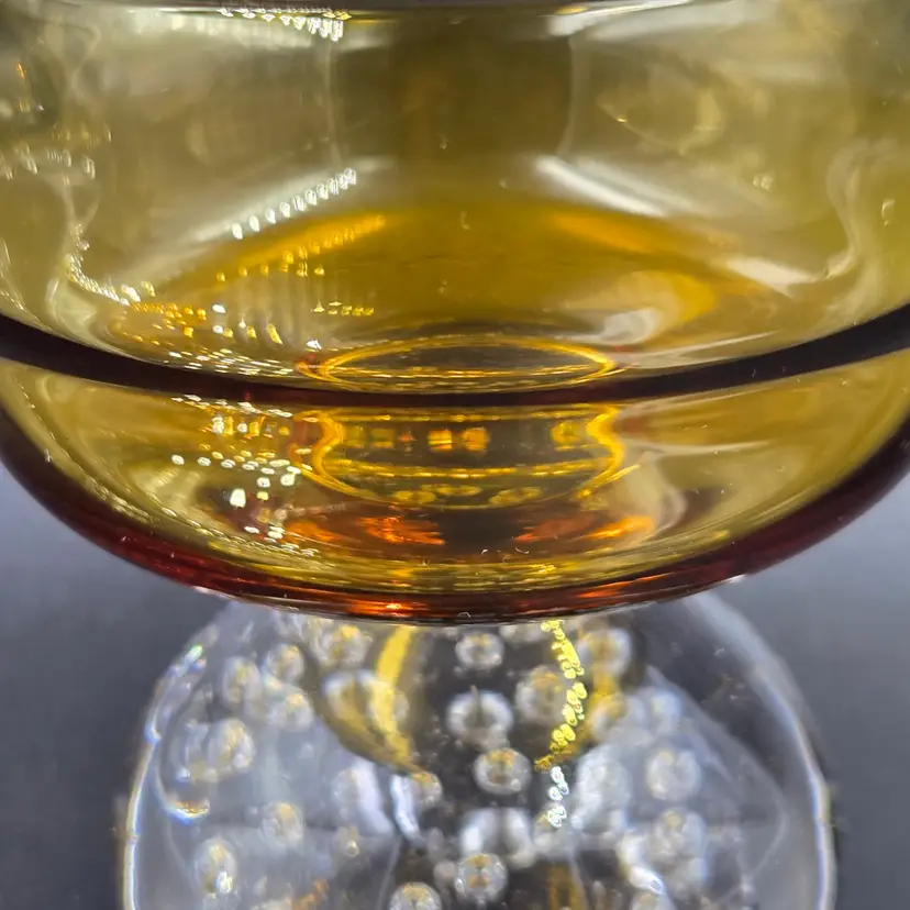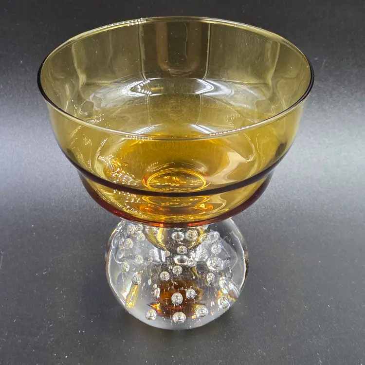 Elegant mid-century Portugal Raindrop Amber champagne glasses or tall sherbet bowls featuring a warm amber bowl atop a clear bubble-filled base. Crafted in Portugal during the 1960s, these hand-blown glass pieces exemplify the artistry of European glassmakers with their fluid form and suspended air bubble detailing. The striking contrast between the translucent amber top and the crystal-clear base adds both texture and sophistication, making them perfect for serving desserts, cocktails, or for display as part of a vintage glassware collection. A refined statement of Modernist design and mid-century craftsmanship.