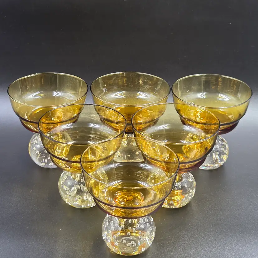 • Portugal Raindrop Amber Glass Set • Vintage Bubble Base Champagne Glasses • Mid Century Modern Amber Sherbet Bowls