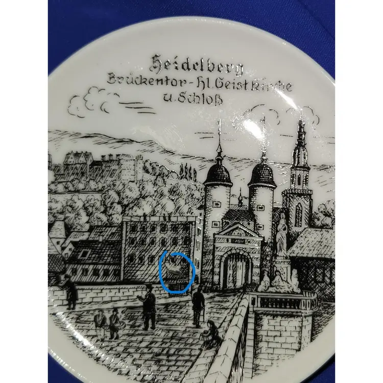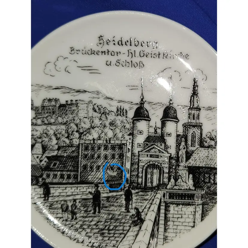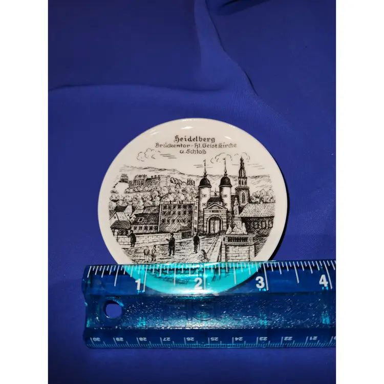 Porzella Souvenir Mini Plate Heidleberg Bruckentor Church of the Holy Spirit Approximately 3 1/2 inches Germany - 1990s One small chip in plate - see picture