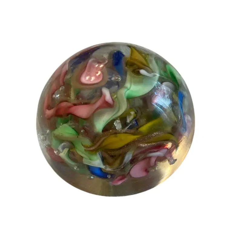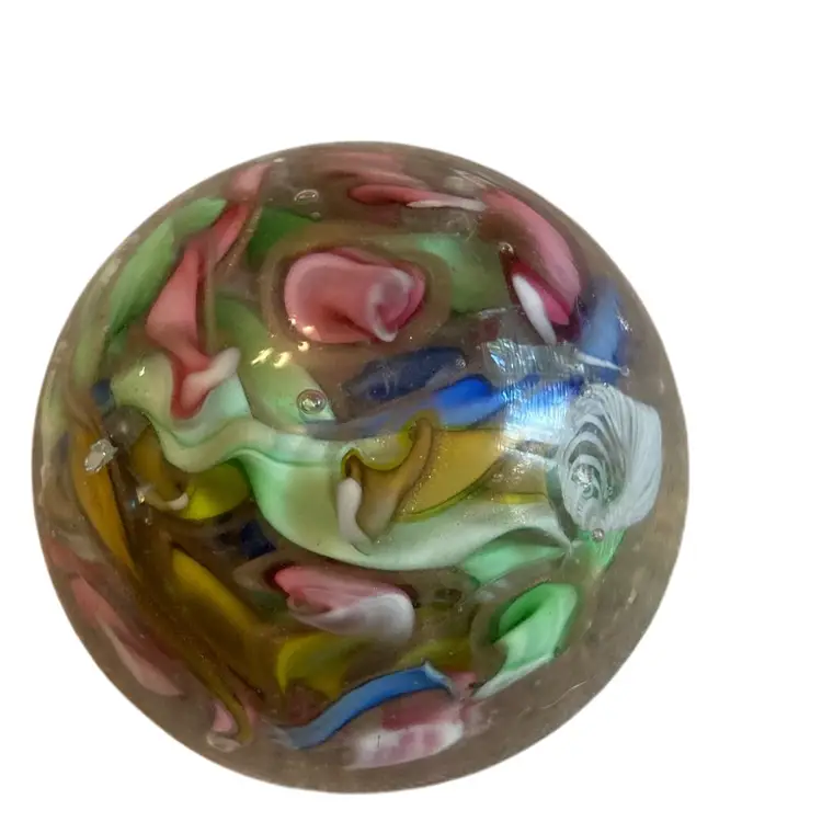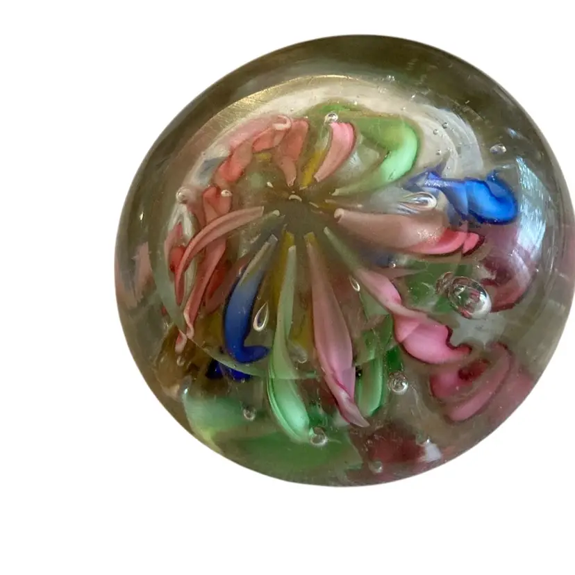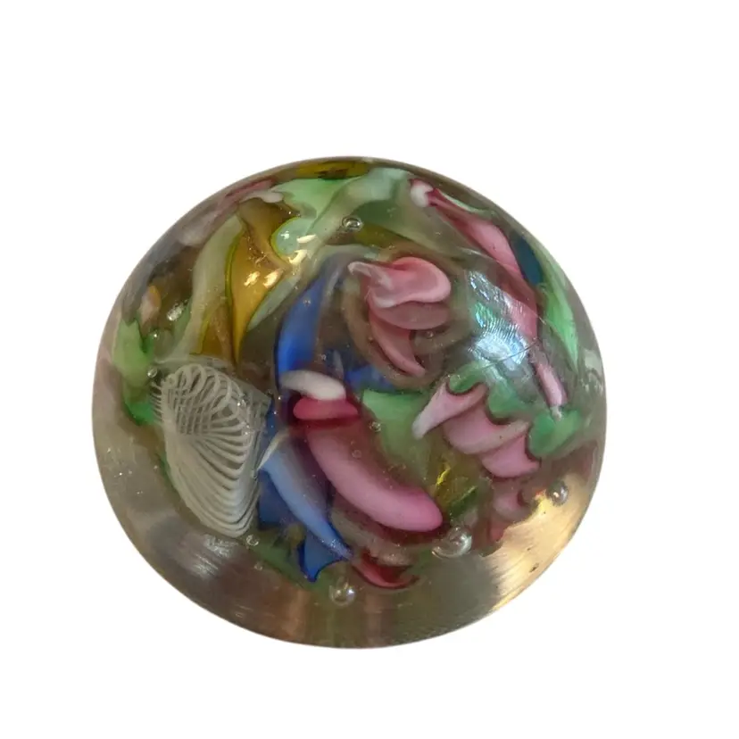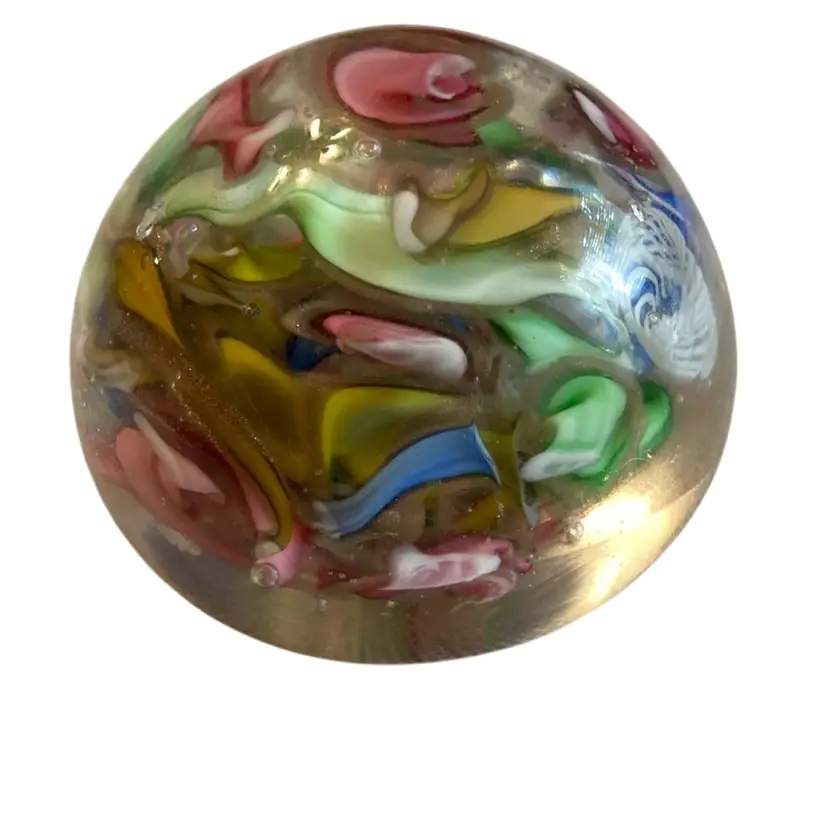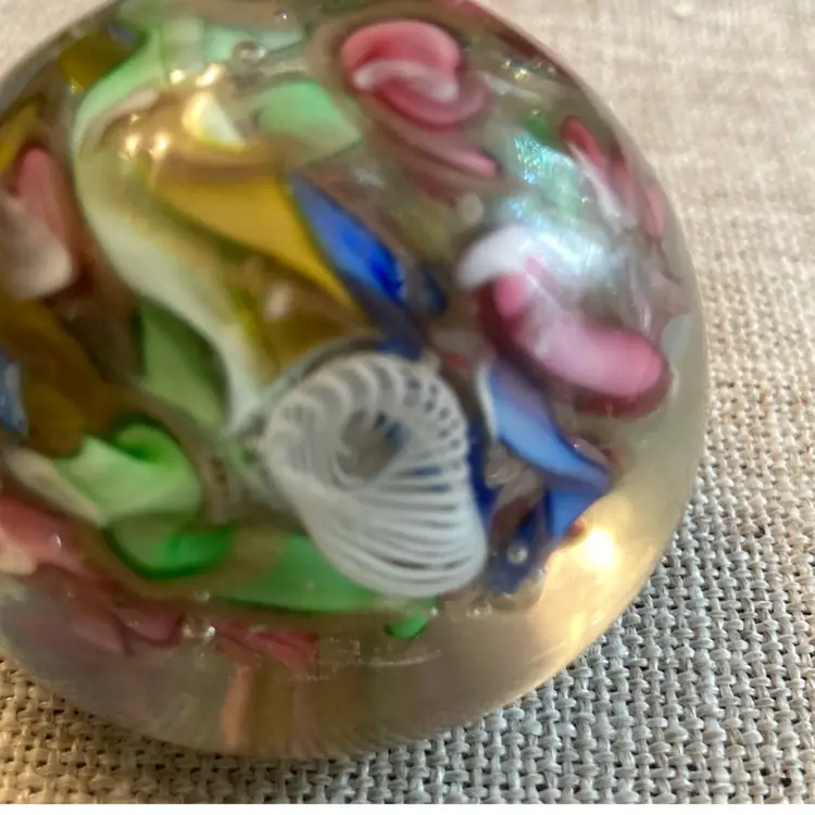 1” tall, 1 3/4” wide. Matches pictures of Murano paperweights in Google Lens but I can’t confirm. Two tiny rough spots above white swirl as shown in last picture.