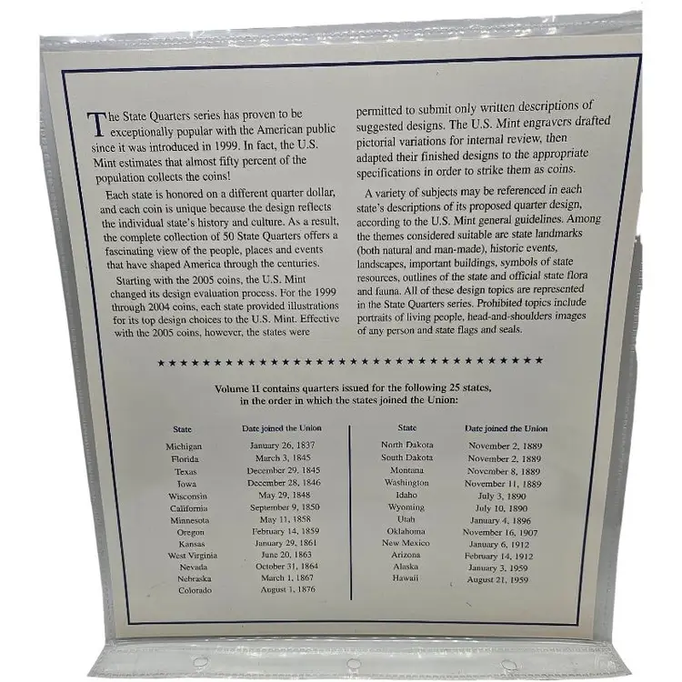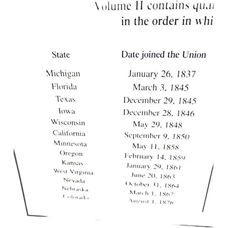 Volume II contains quarters issued for the following 25 states. In the order in which the states joined the union: