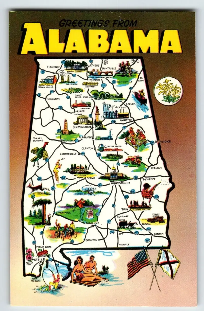Number of Items in Set: 1 Unit of Sale: Single Unit Artist: Unknown Occasion: Sayings & Quotes Size: Standard (5.5 x 3.5 in) Signed: No Custom Bundle: No Year Manufactured: 1969 Material: Paper City: Multi Original/Licensed Reprint: Original Franchise: None Brand/Publisher: Colourpicture Subject: Map Postcard Continent: North America Type: Printed (Lithograph) Era: Photochrome (1939-Now) Region: Alabama Country: United States Theme: State Maps Features: Chrome Time Period Manufactured: 1960-1969 Country/Region of Manufacture: United States Postage Condition: Unposted