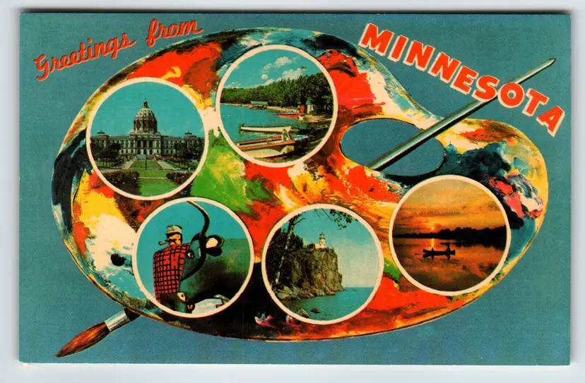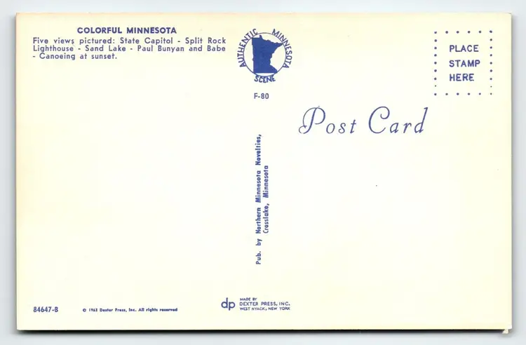 Number of Items in Set: 1 Unit of Sale: Single Unit Artist: Unknown Occasion: Sayings & Quotes Size: Standard (5.5 x 3.5 in) Custom Bundle: No Material: Paper City: None Original/Licensed Reprint: Original Brand/Publisher: Dexter Subject: Painting Continent: North America Type: Printed (Lithograph) Era: Post-War (1945-Now) Region: Minnesota Country: USA Theme: Greetings, States Features: Chrome Time Period Manufactured: 1930's-1950's Country/Region of Manufacture: United States Postage Condition: Unposted
