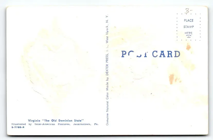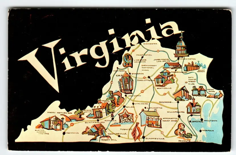 Number of Items in Set: 1 Unit of Sale: Single Unit Artist: Unknown Occasion: Sayings & Quotes Size: Standard (5.5 x 3.5 in) Signed: No Custom Bundle: No Year Manufactured: 1969 Material: Paper City: Multi Original/Licensed Reprint: Original Franchise: None Brand/Publisher: Dexter Subject: Map Postcard Continent: North America Type: Printed (Lithograph) Era: Photochrome (1939-Now) Region: Virginia Country: United States Theme: State Maps Features: Chrome Time Period Manufactured: 1960-1969 Country/Region of Manufacture: United States Postage Condition: Unposted