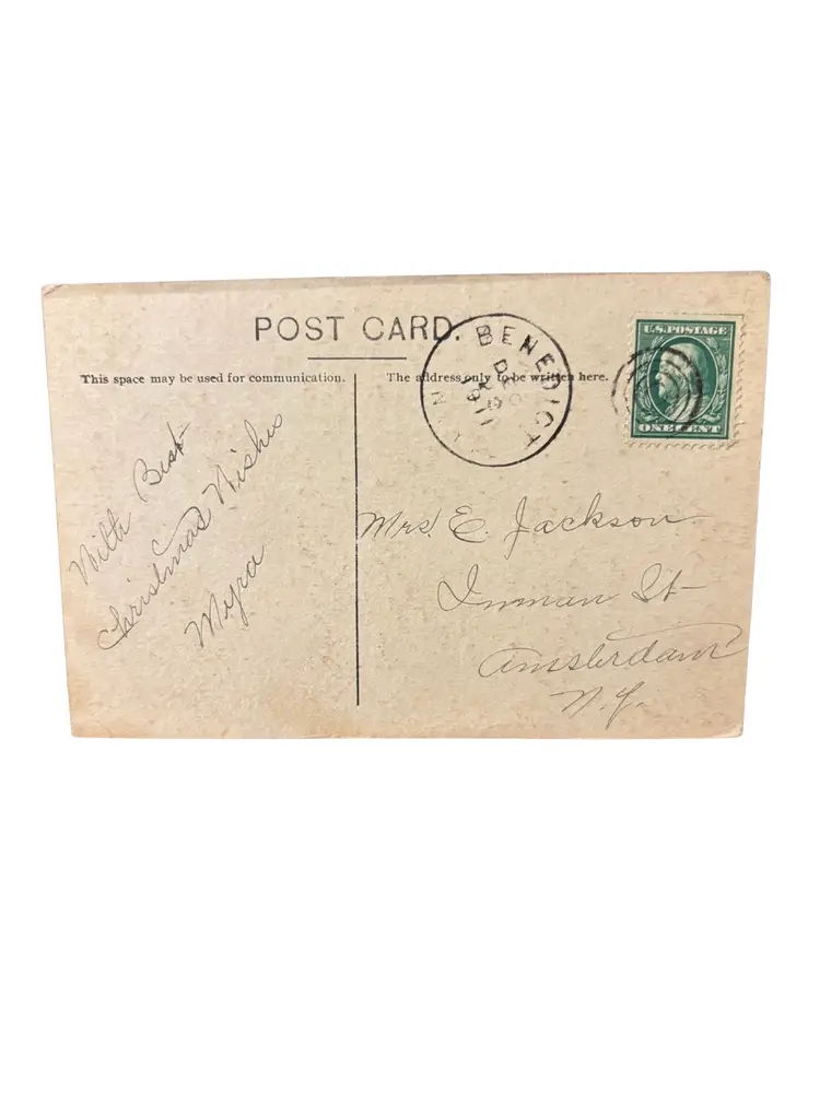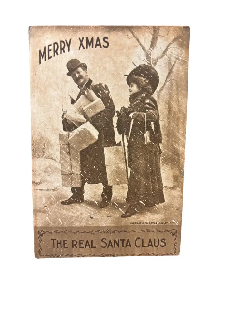 This listing is for one antique Christmas postcard published by Roth & Langley around 1909. The front features a fashionable dressed man and woman shopping in the snow with many gift packages. This postcard uses humor by calling the man “the real Santa Claus”. On the back, it is stamped and postmarked for 1911. The back features original owners message. Overall the postcard is in excellent antique condition. There is minor discoloration/ staining and some signs of corner aging- as seen in picture. Will ship top loaded for protection.