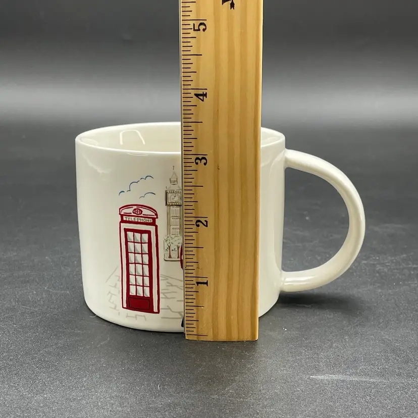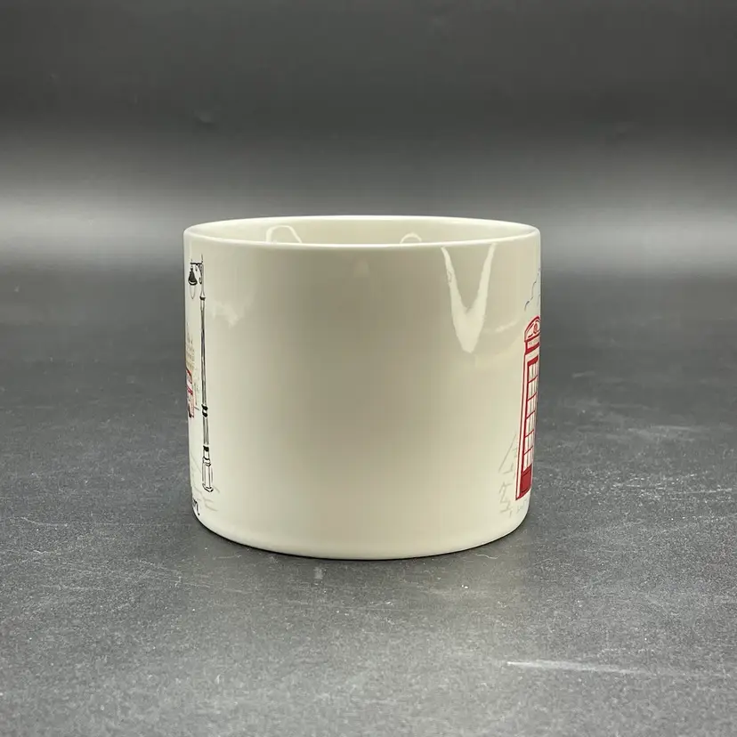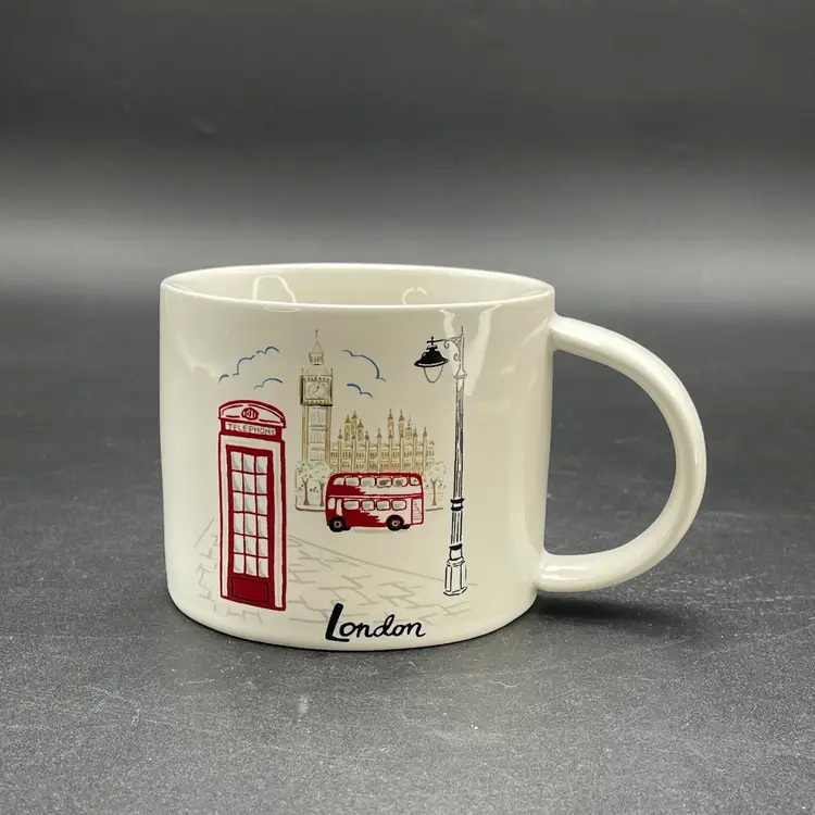 This is a Pottery Barn London coffee mug depicting a double decker bus, a telephone booth, Big Ben, a light post, and the Palace of Westminster. Measures approximately 3" tall x 3.5" across the top and holds approximately 13.5fl oz. No box. No chips or cracks.
