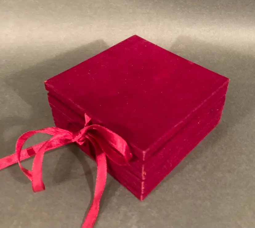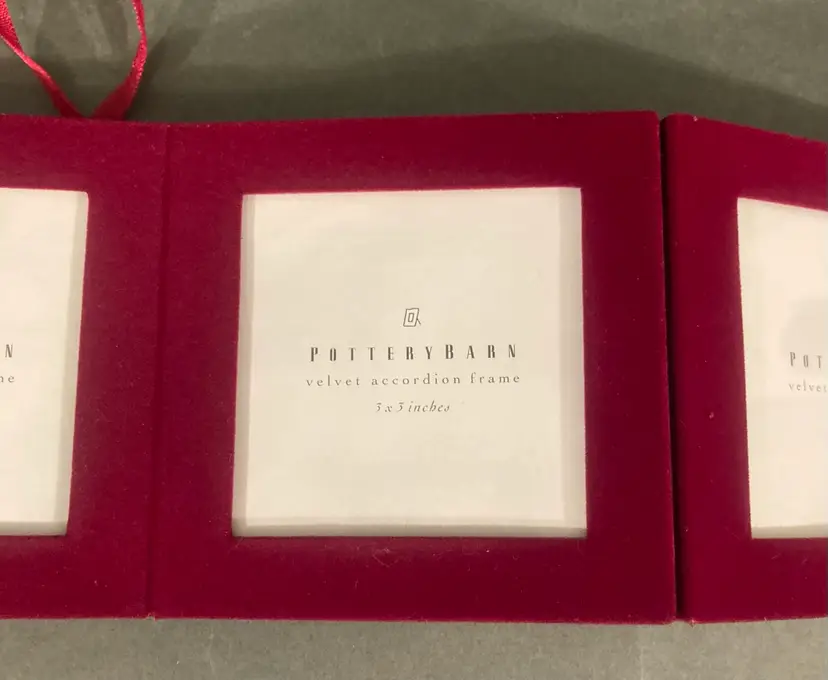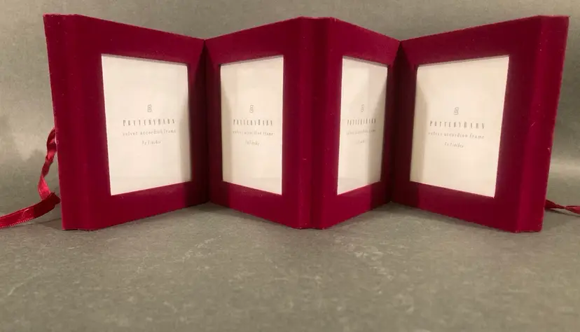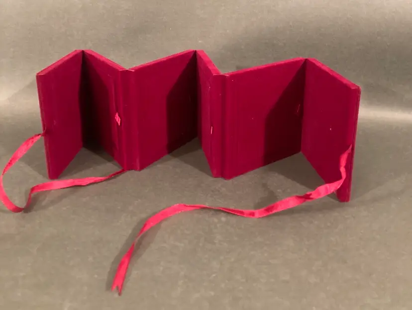 This is obviously not very old, but it is great quality and perfect for Valentine’s Day! Holds four 3” x 3” photos under glass and folds into a cute little package. Excellent condition — likely never used.