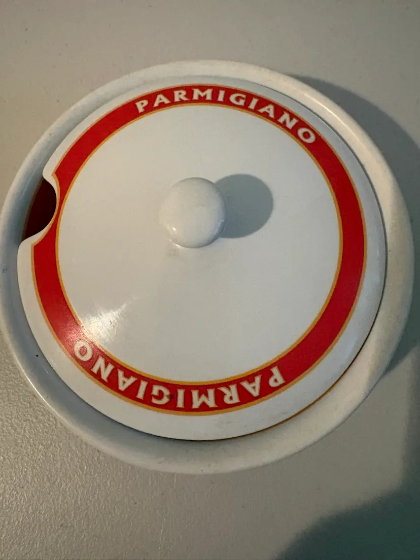 The Pottery Barn Vintage Pasta Collection Covered Parmigiano Cheese Bowl with Lid is a charming addition to any dining table. Made of ceramic, this round bowl features a vintage posters pattern in white, making it perfect for all occasions. The bowl comes with a lid and has a diameter of 4.5 inches, ideal for serving up cheese or pasta sauce. Microwave and dishwasher safe, this original Pottery Barn piece adds a touch of contemporary style to your kitchen decor.