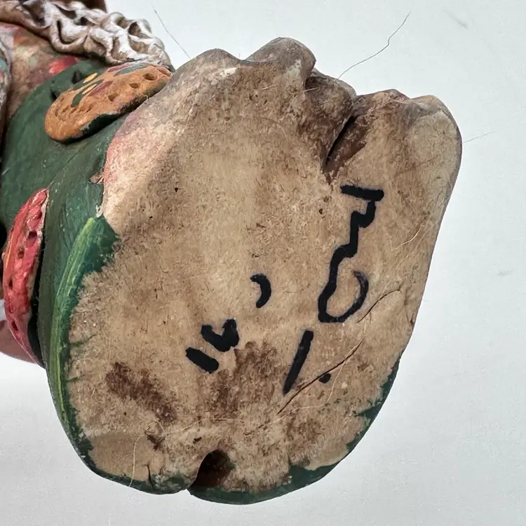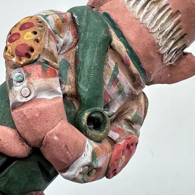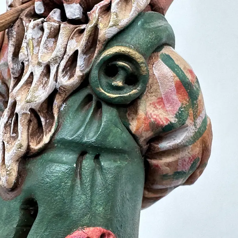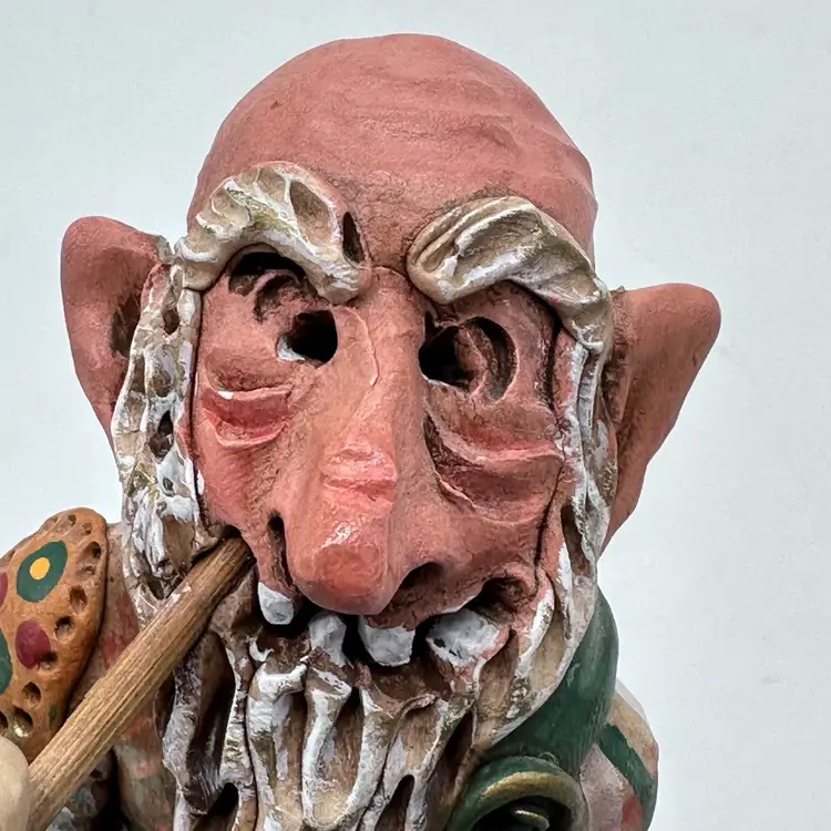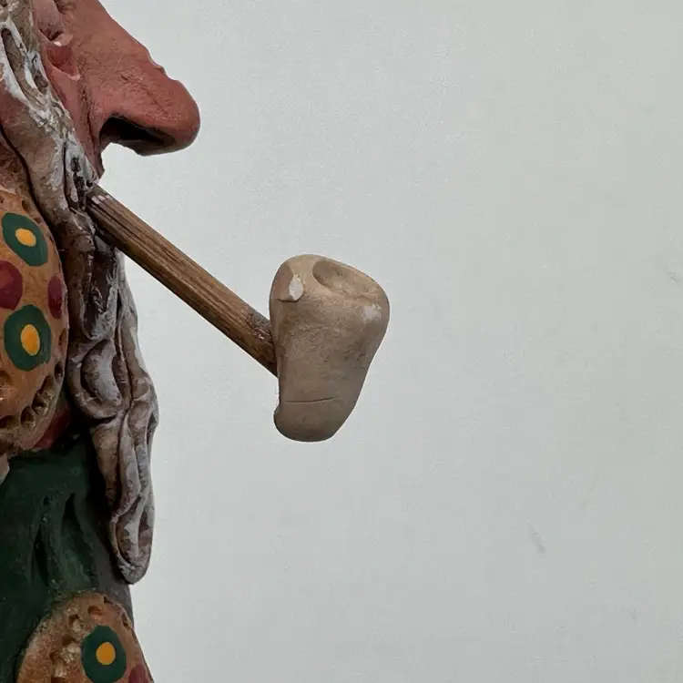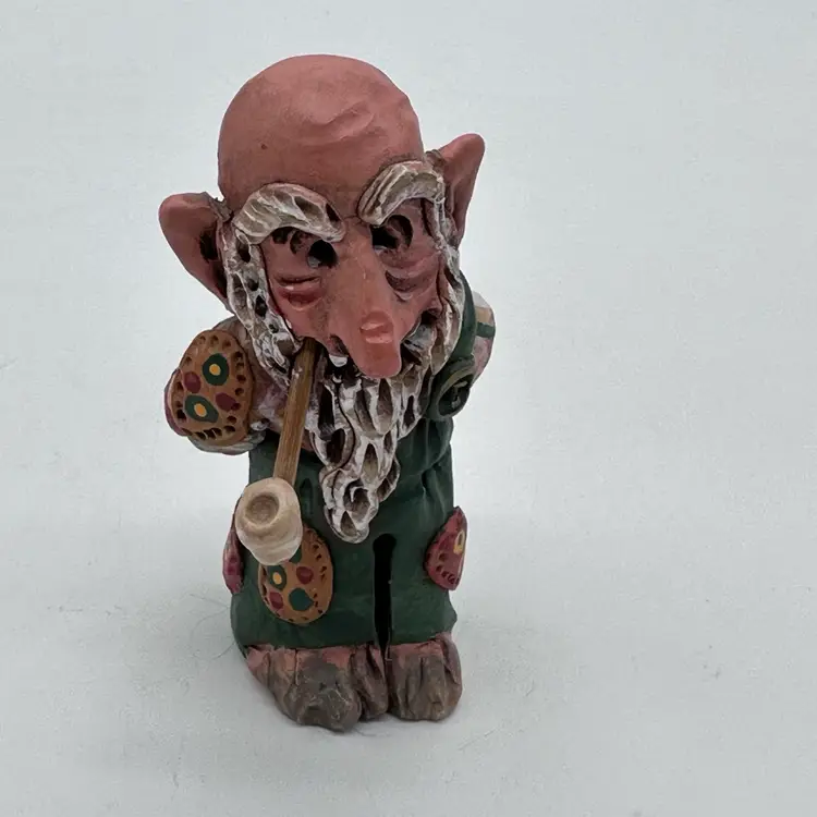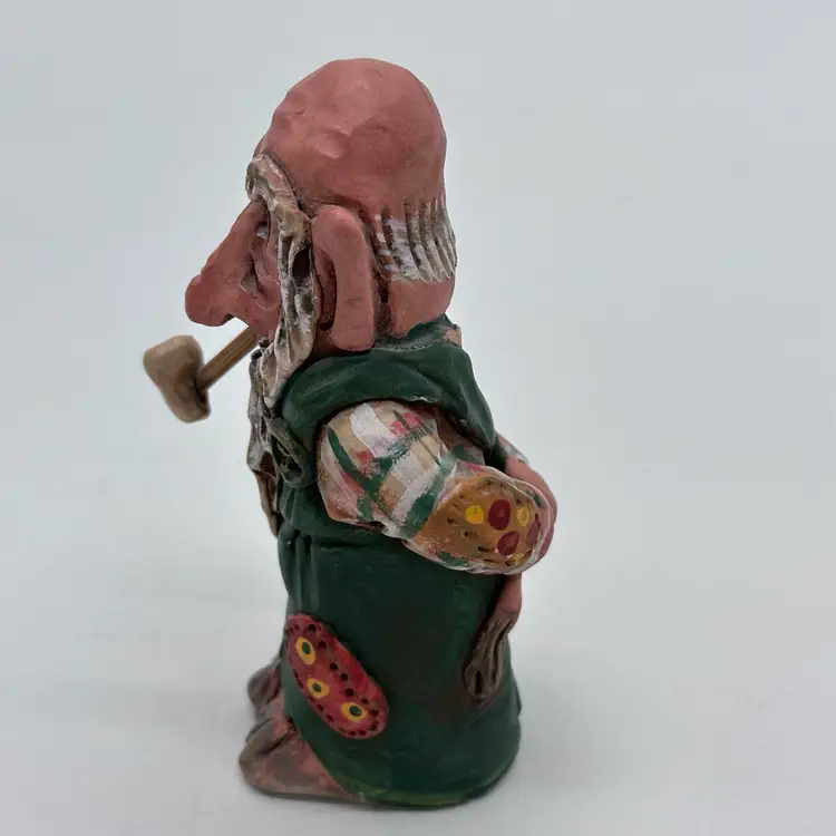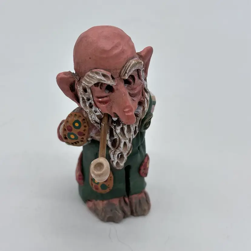 This unique and charming figurine is a true work of art, handmade from pottery clay by a skilled artist. The piece depicts an old man gnome smoking a pipe, with intricate details and a delightful fantasy theme. The figurine is signed by the artist but the signature is not identified.